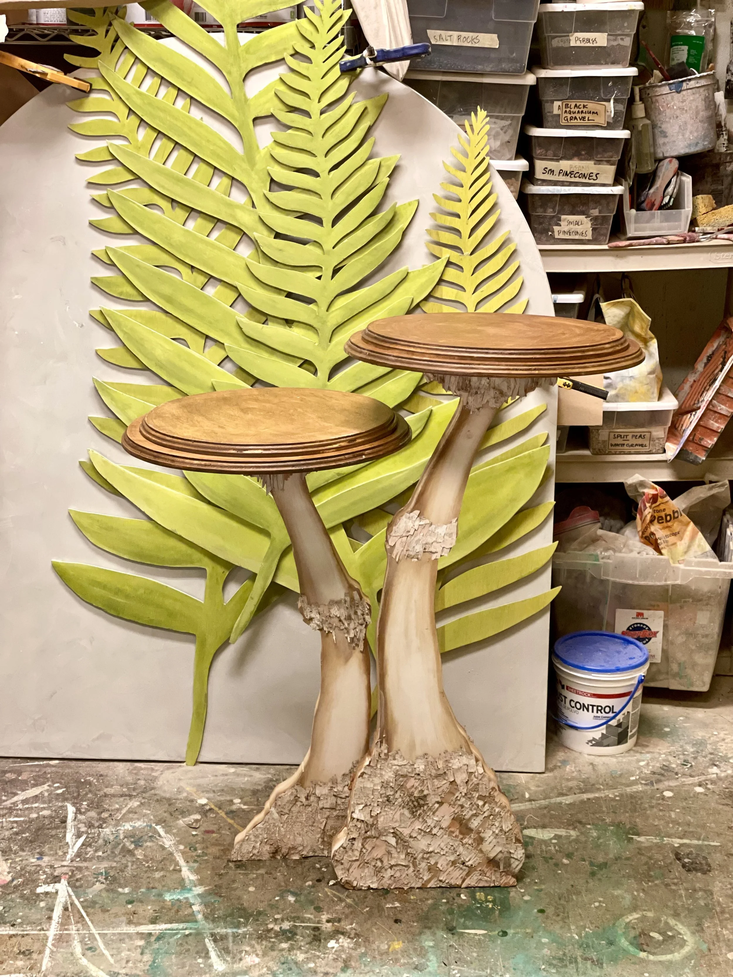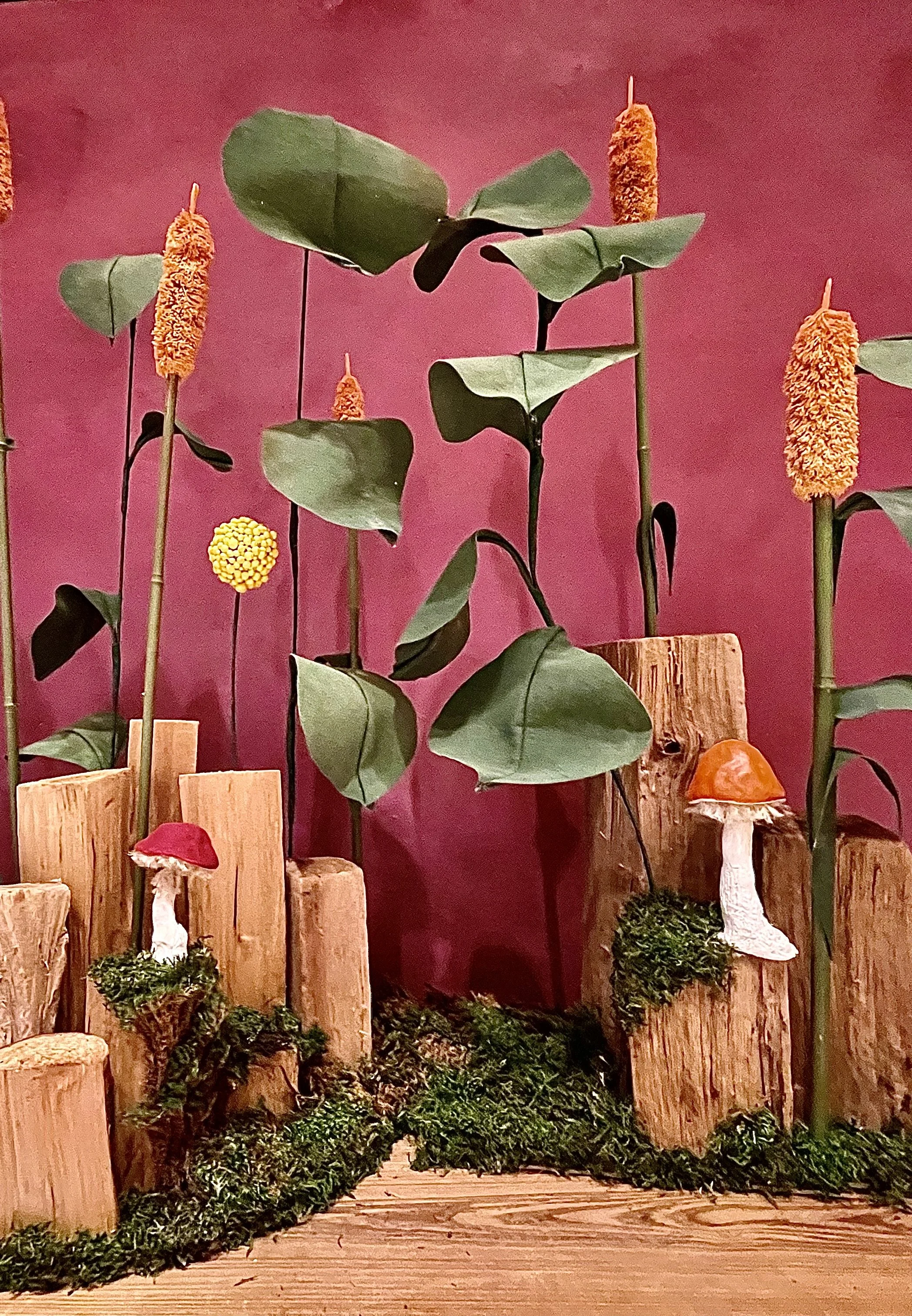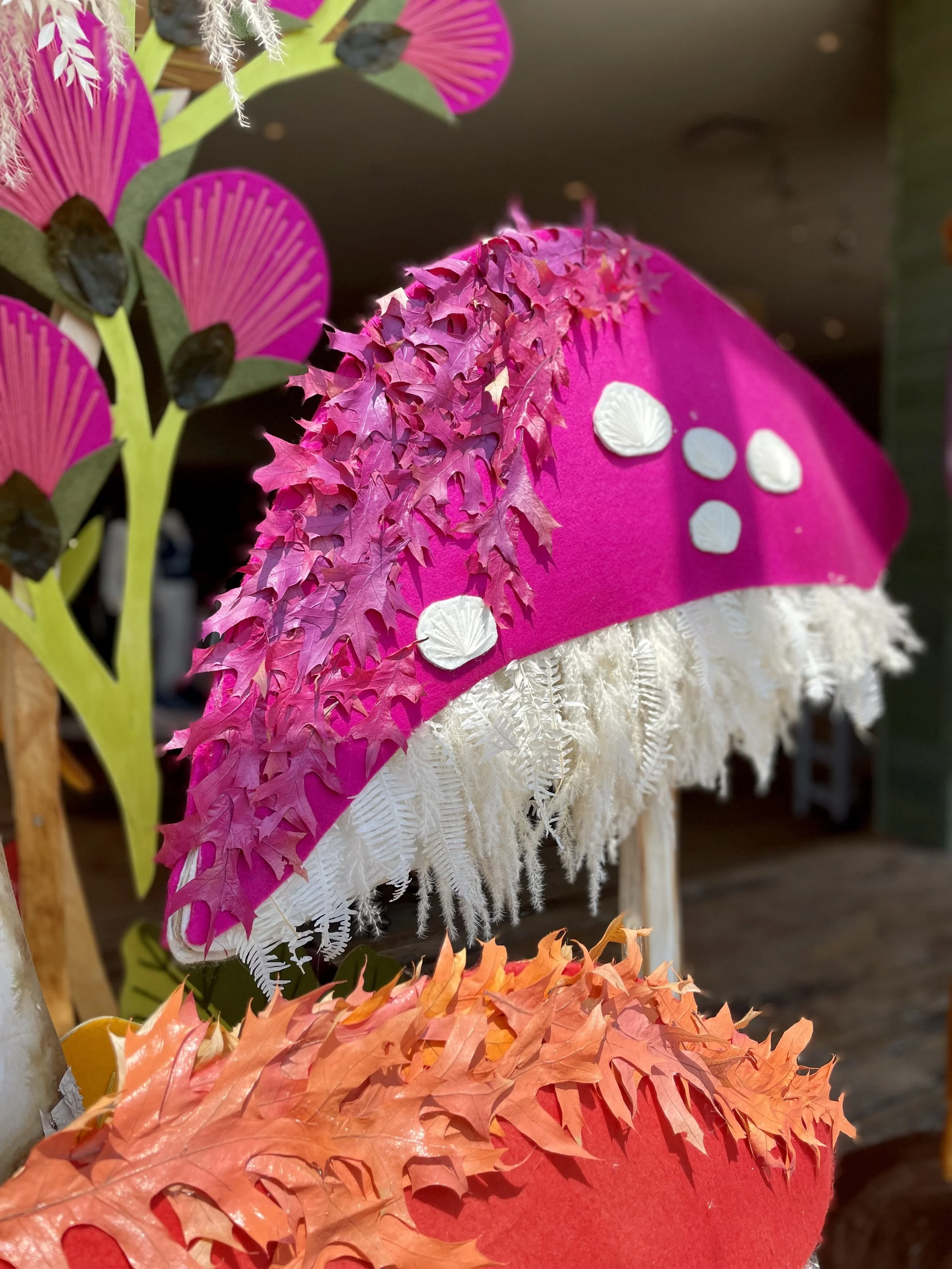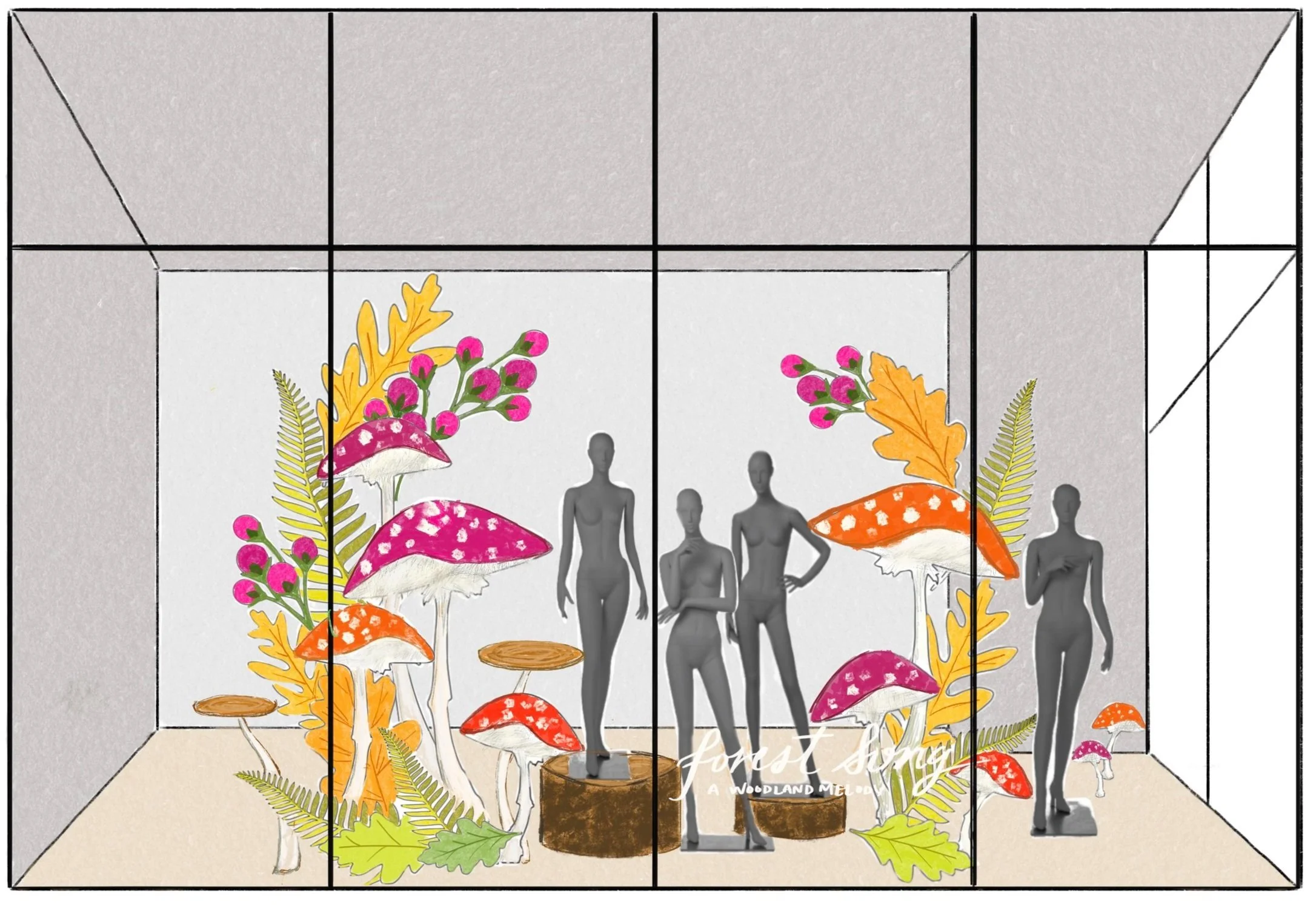 Over- scaled 2D elements of nature (mushrooms, ferns, thistles, oak leaves, and berries) were composed in decorative arrangements to tell the story of the perfect, enchanting forest scene.