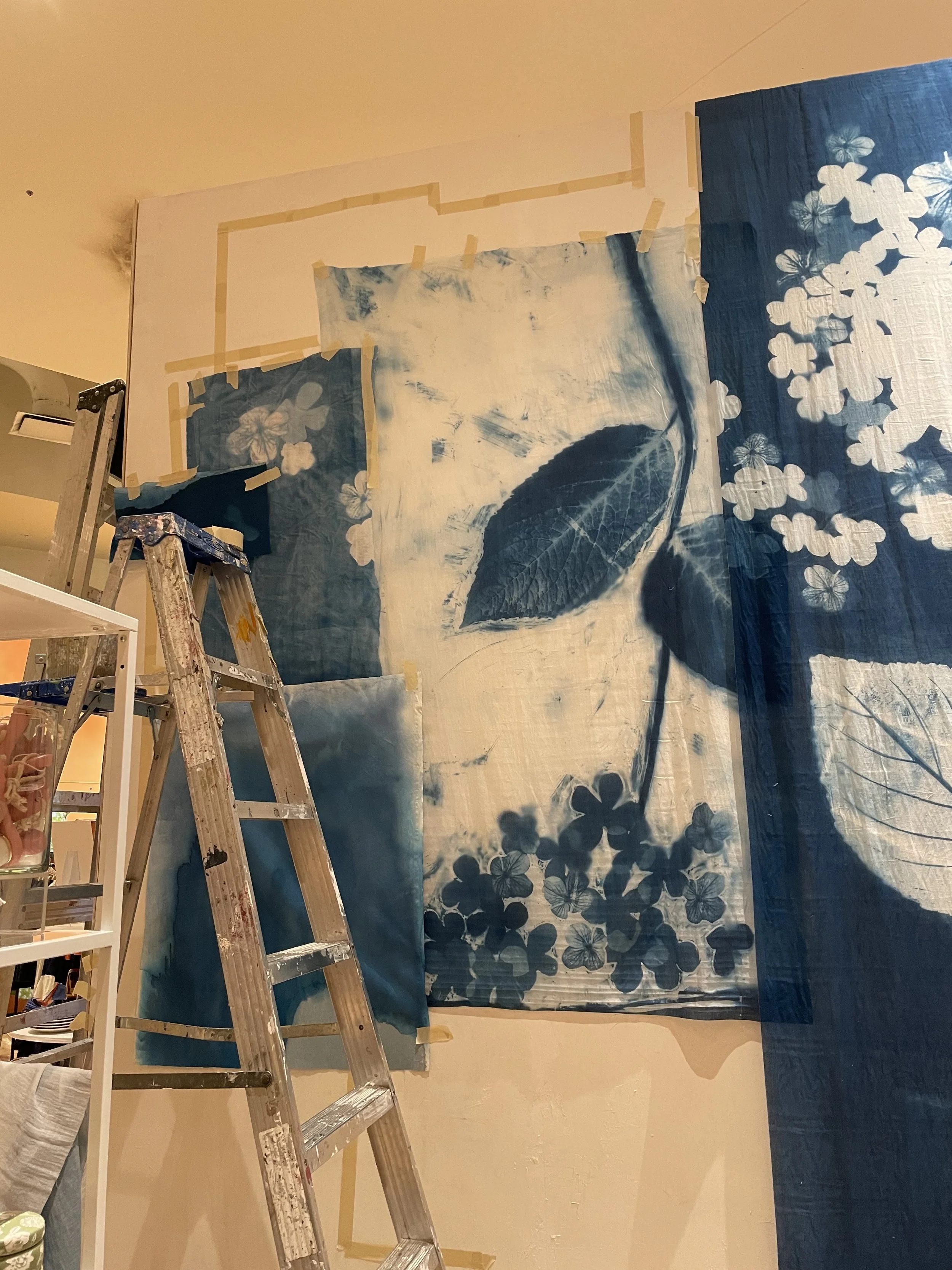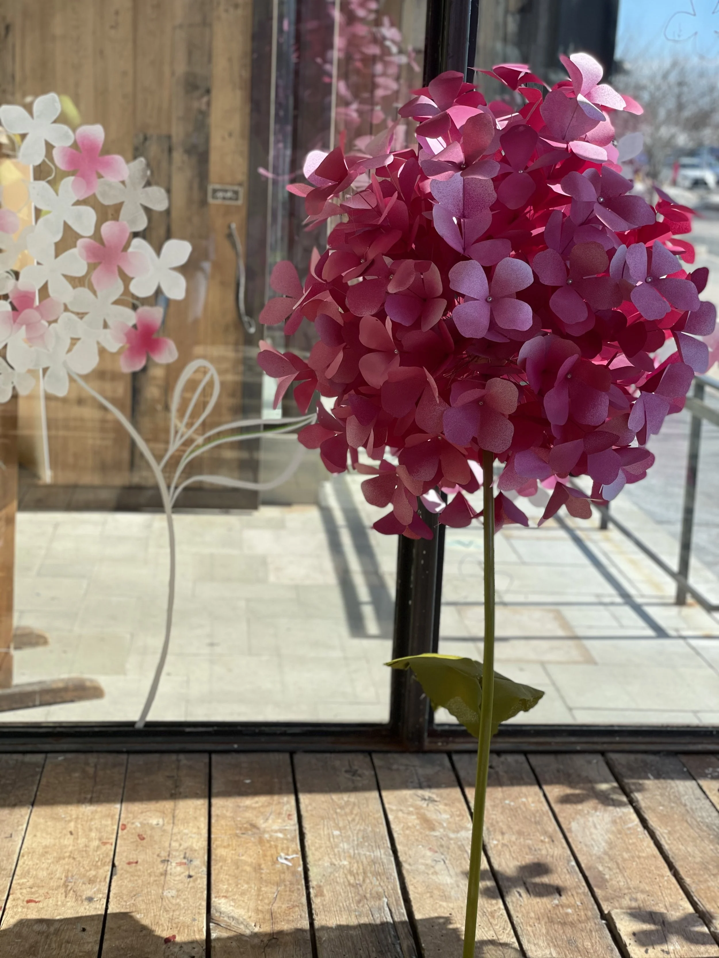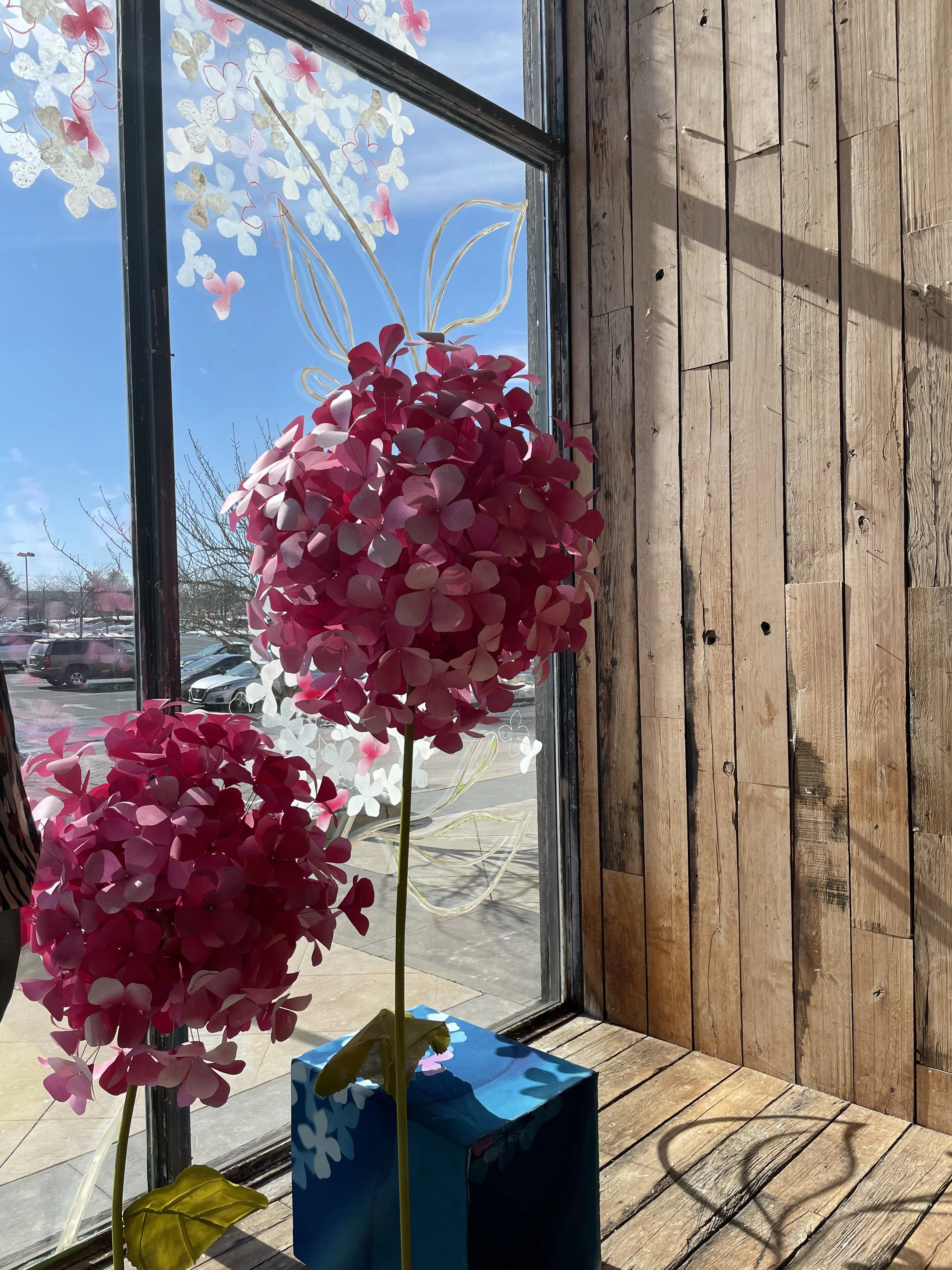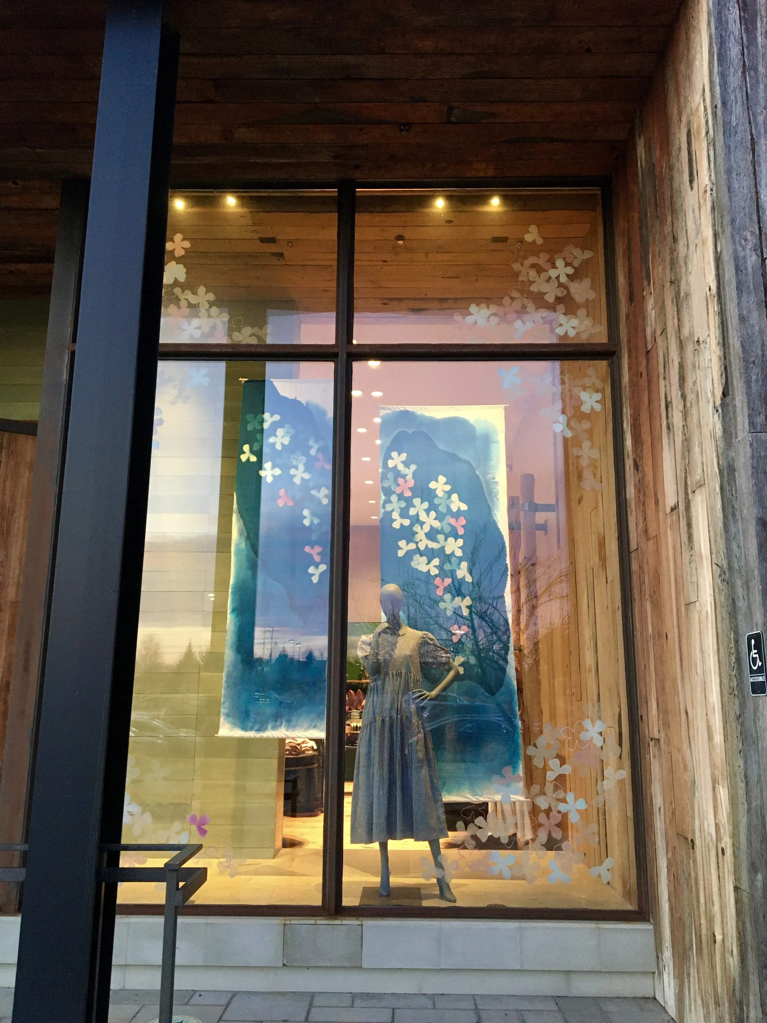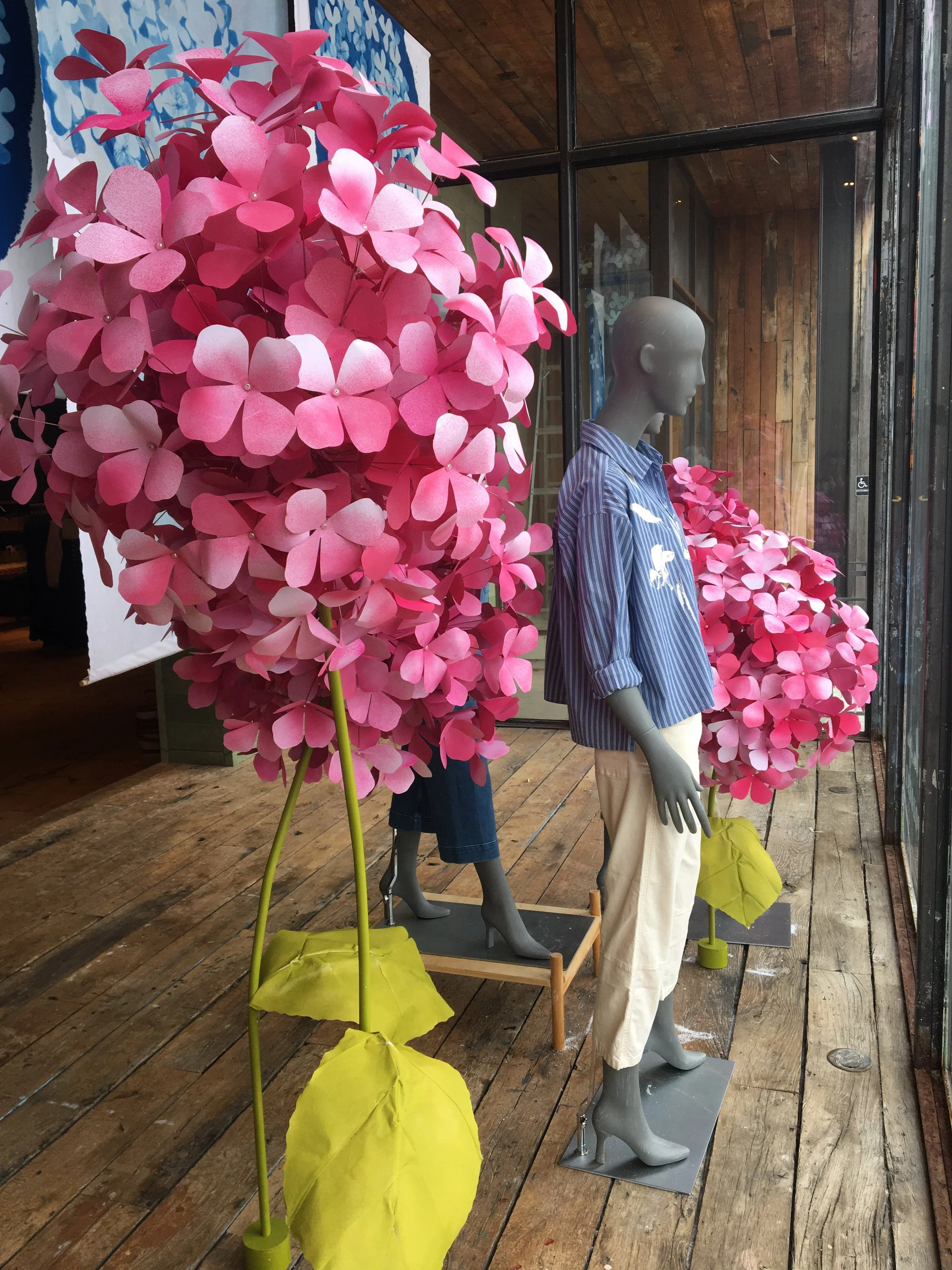 This season's spring windows were all about hydrangeas! 3D sculputral hydrangea blooms were layered against 2D prints of hydrangeas. These season introduced a new process - cyanotype printing. This photographic process uses ferric ammonium citrate and potassium ferricyanide to produce a cyan blue print when exposed to sunlight. It’s the process that created the term “"blueprint,” and dates back to the 1800s.
