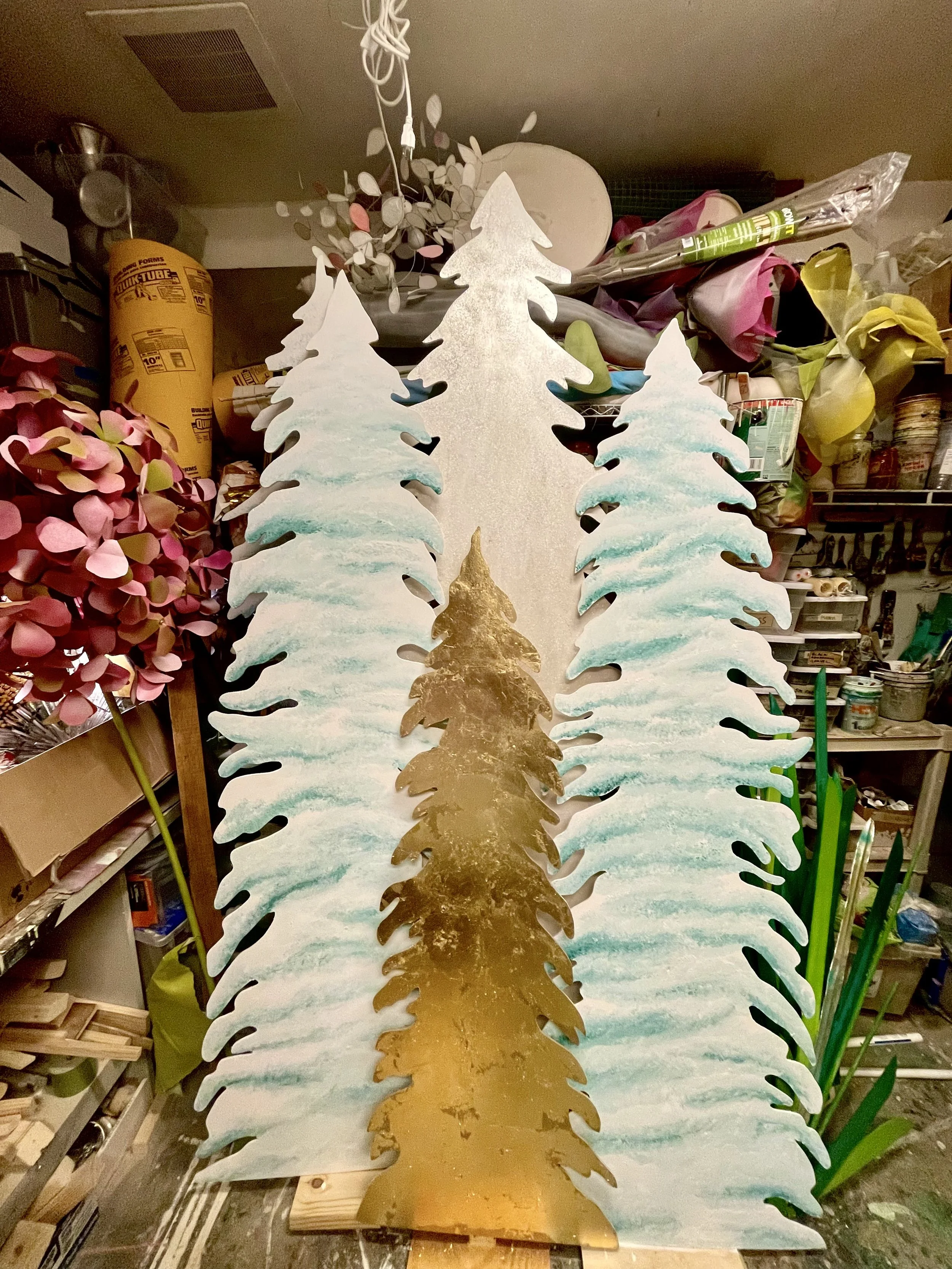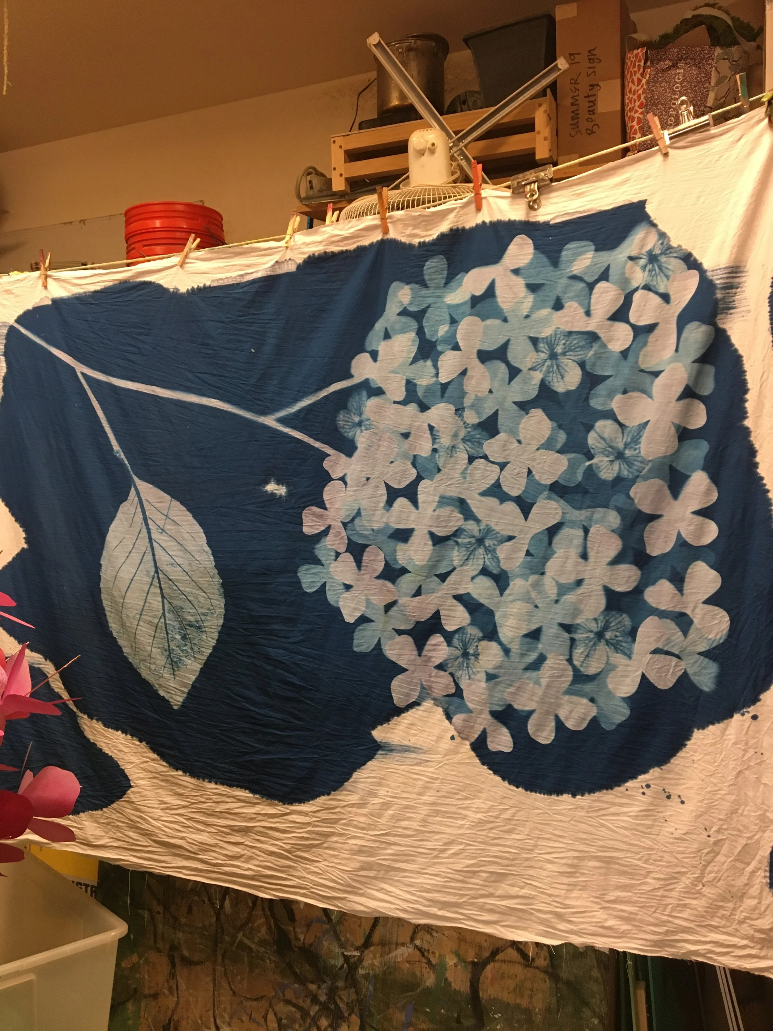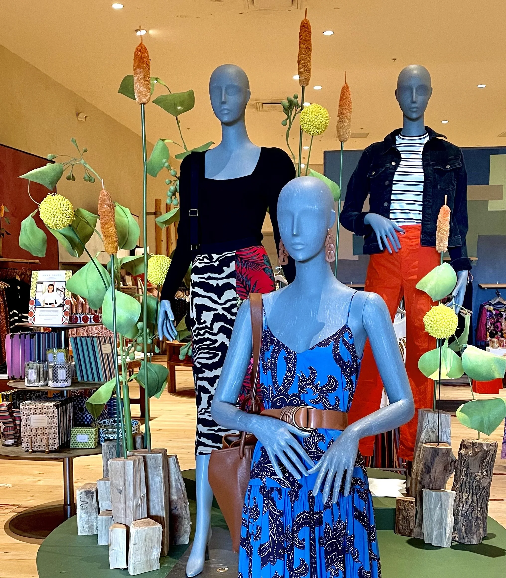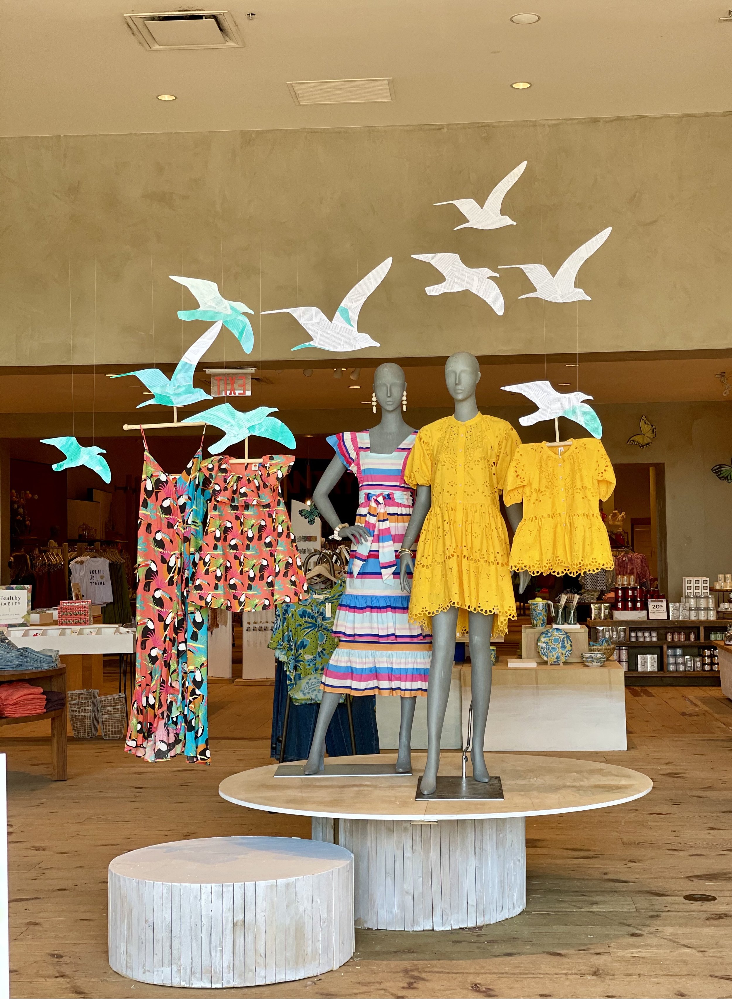 This season's spring windows were all about hydrangeas! 3D sculputral hydrangea blooms were layered against 2D prints of hydrangeas. These season introduced a new process - cyanotype printing. This photographic process uses ferric ammonium citrate and potassium ferricyanide to produce a cyan blue print when exposed to sunlight. It’s the process that created the term “"blueprint,” and dates back to the 1800s.