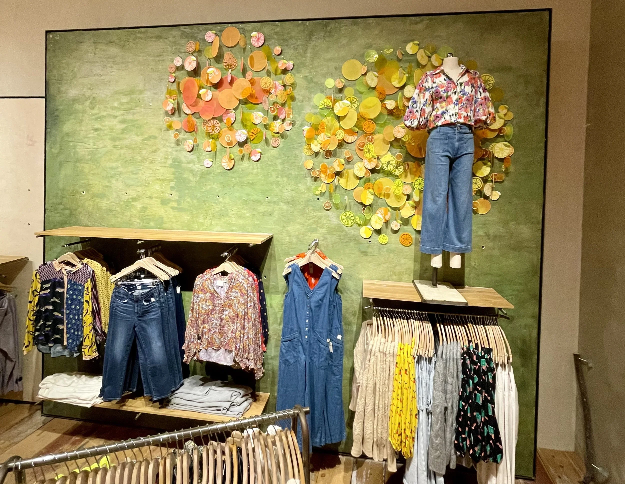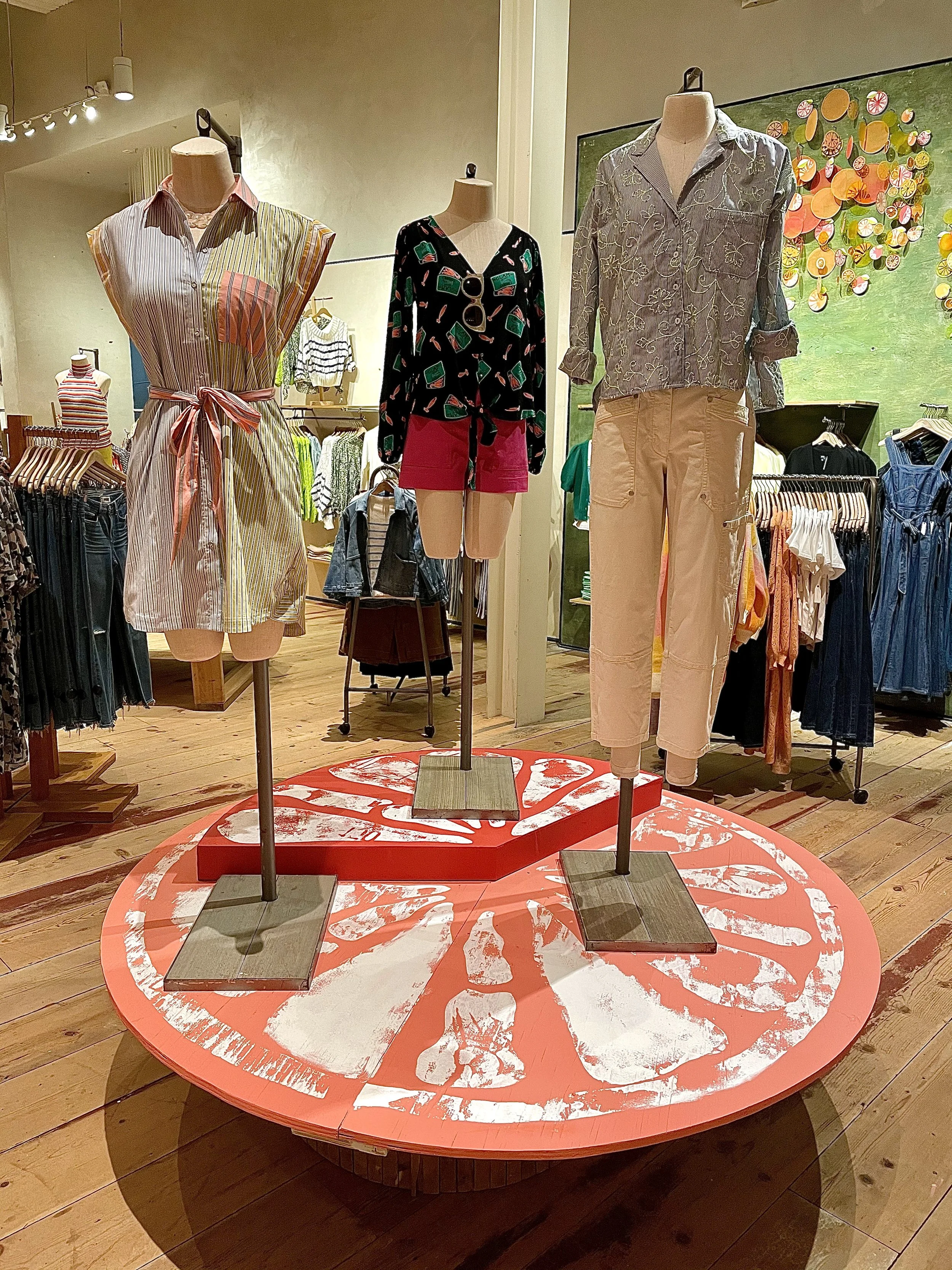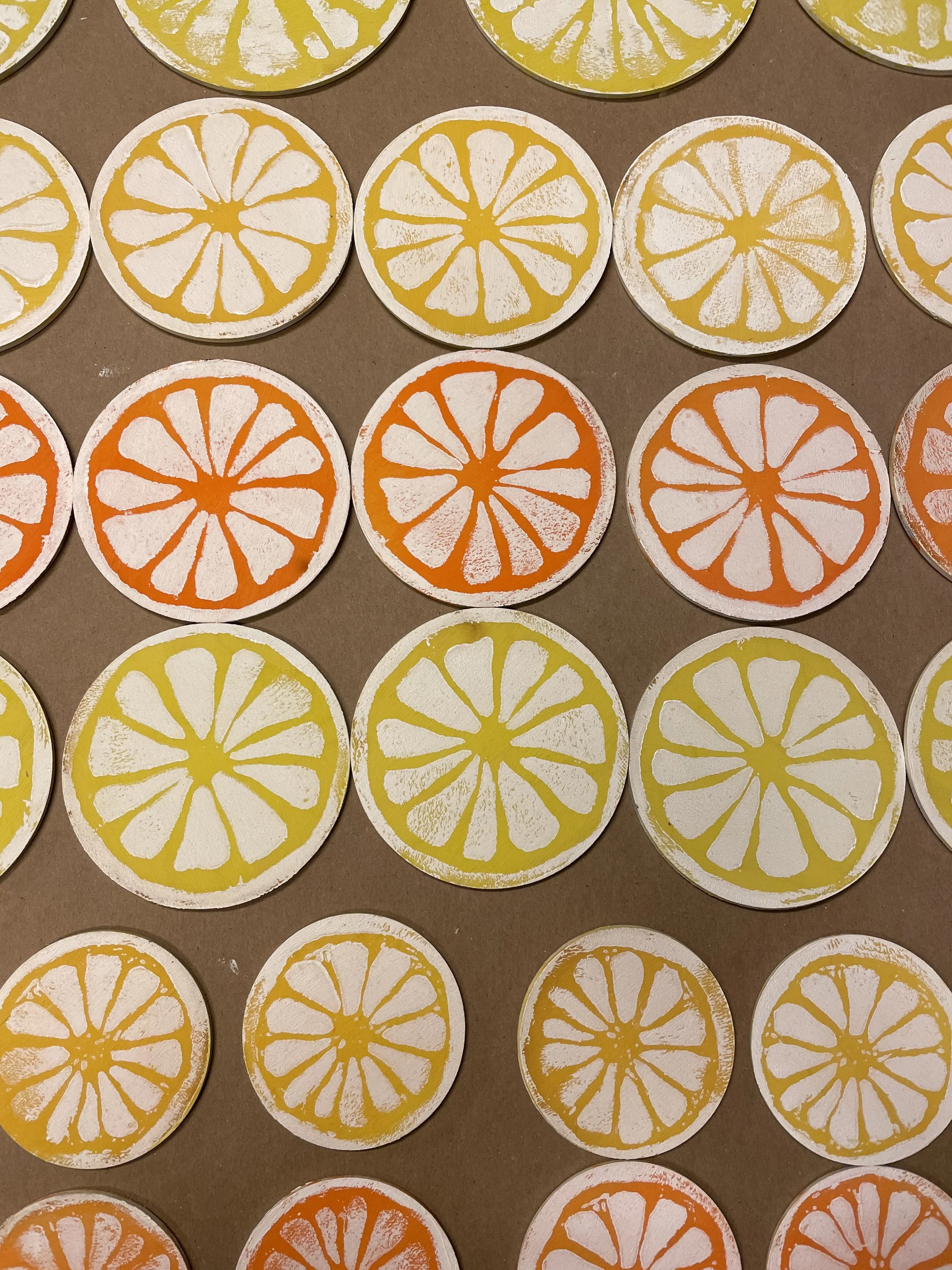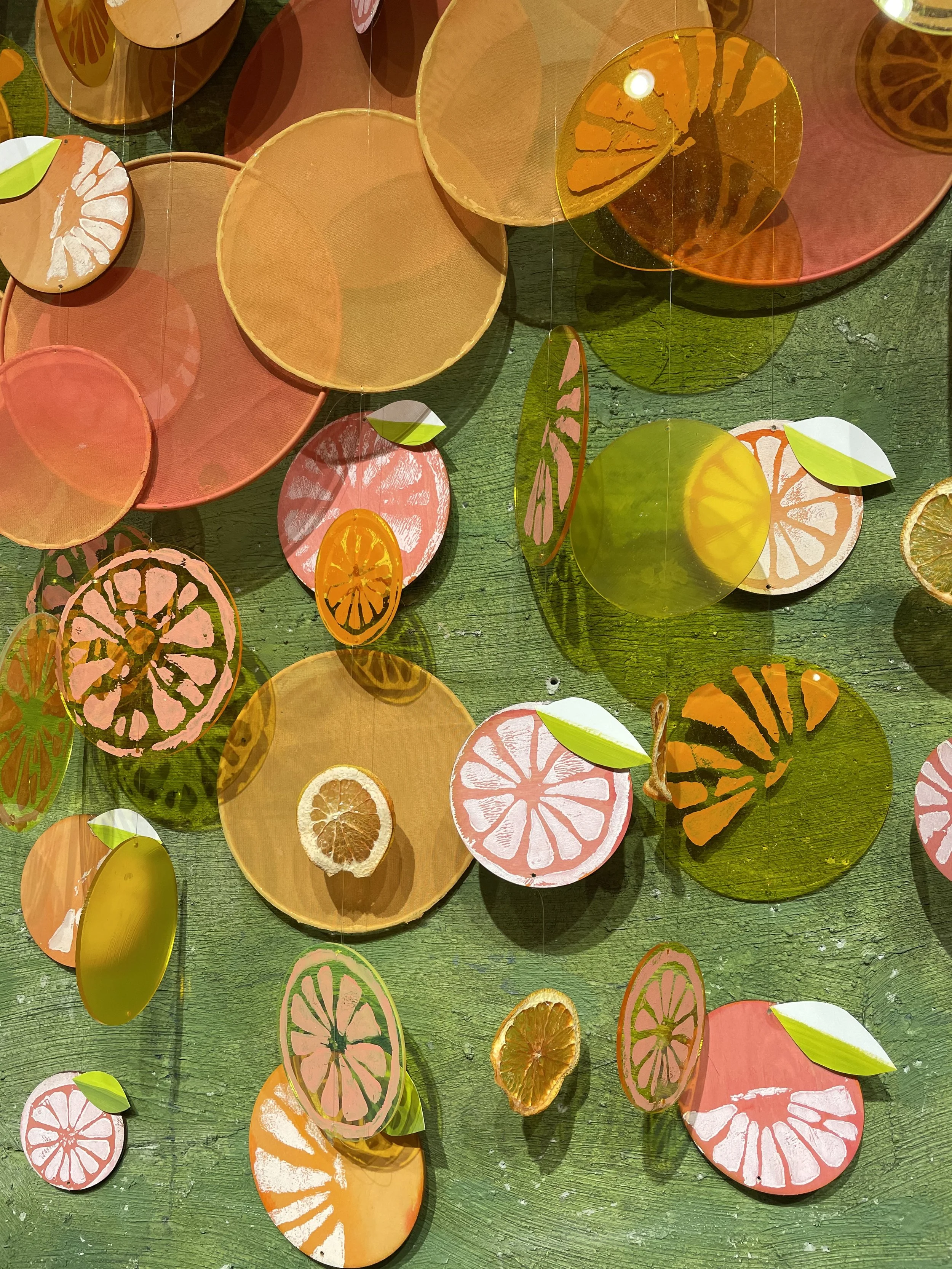Plexi rounds, wood rounds, fabric rounds, and real dried fruit all played together to create a vibrant display inspired by sliced citrus