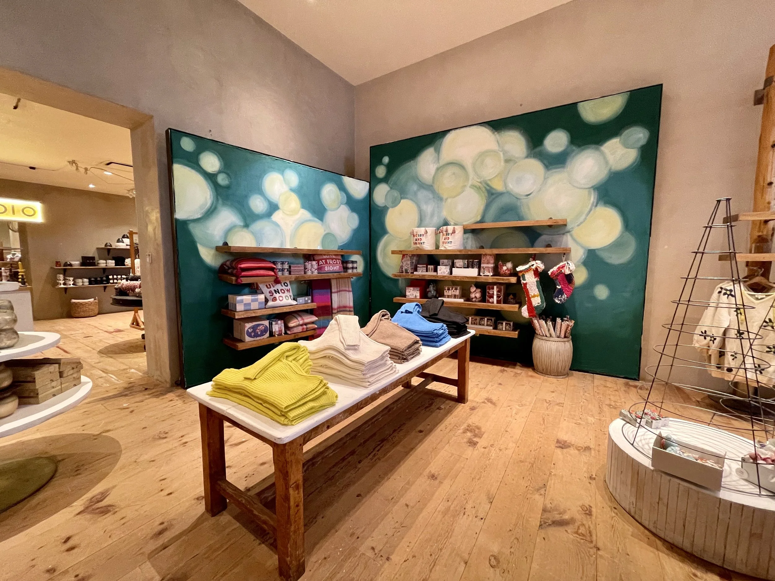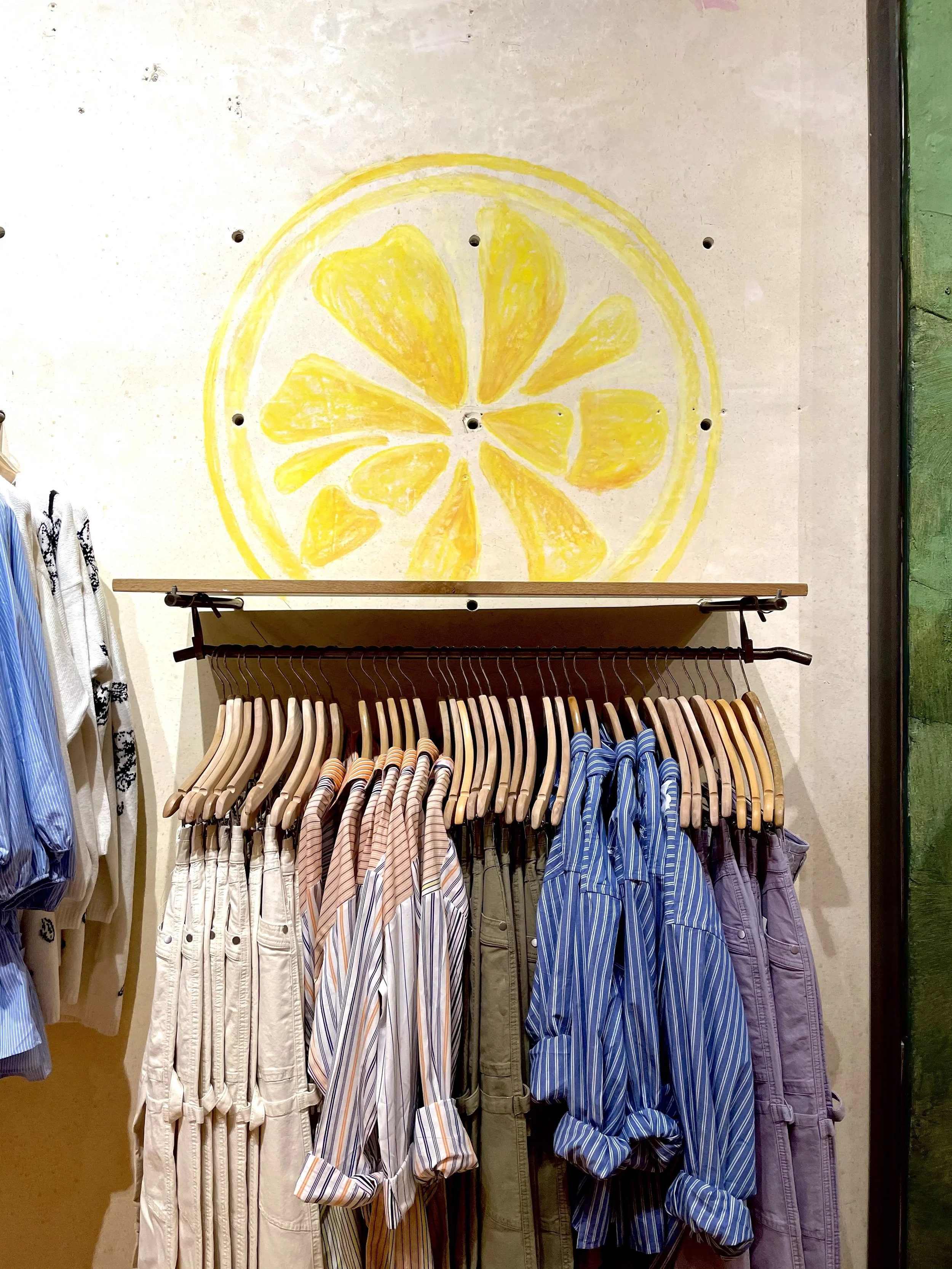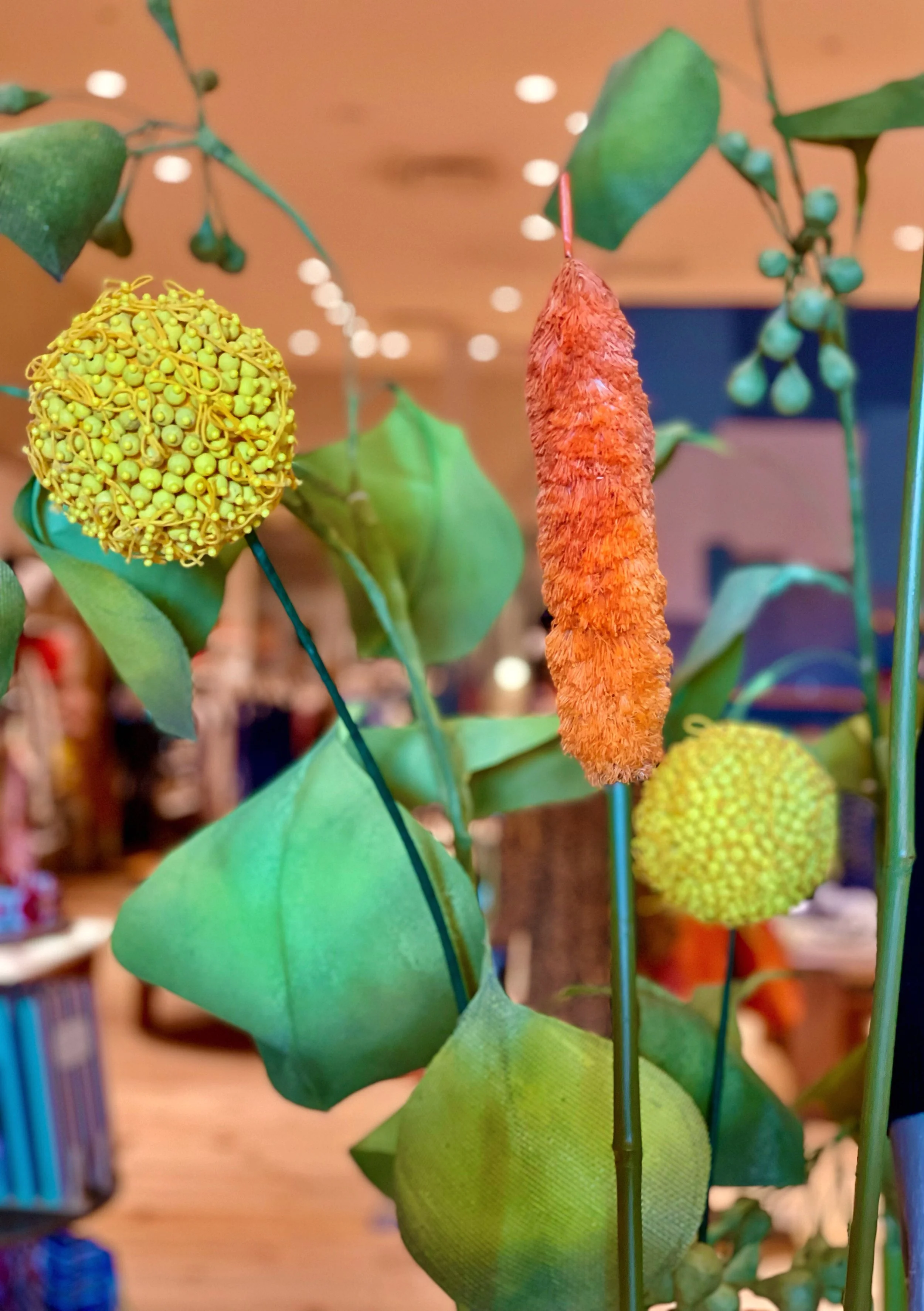 Plexi rounds, wood rounds, fabric rounds, and real dried fruit all played together to create a vibrant display inspired by sliced citrus