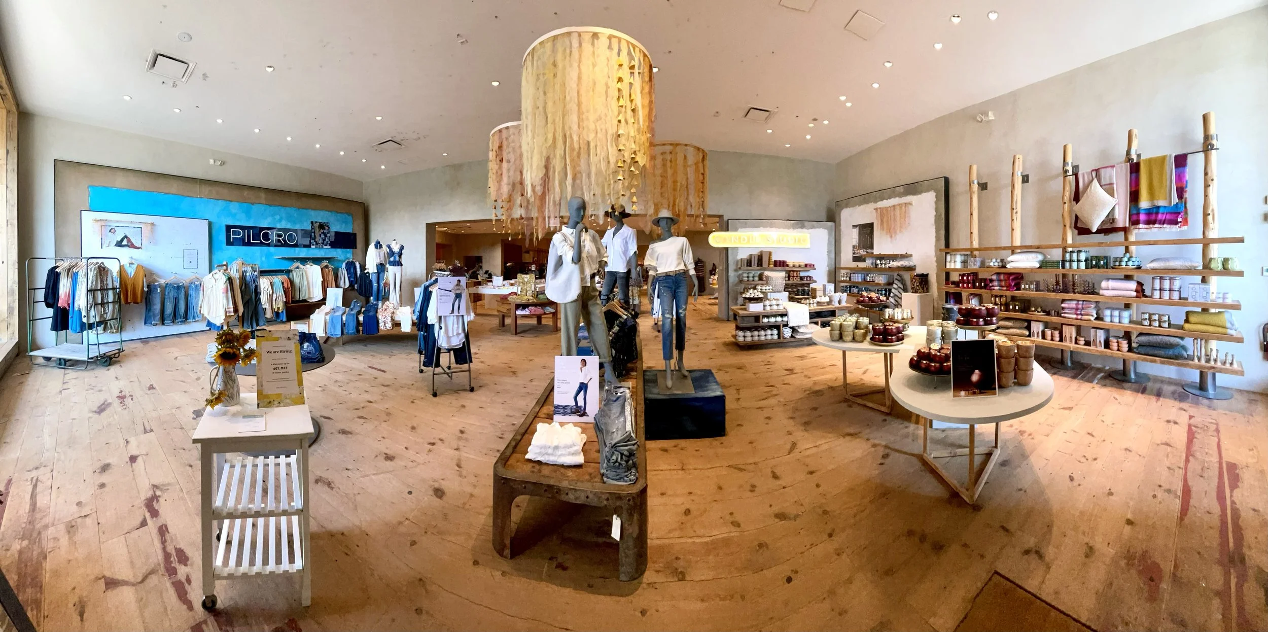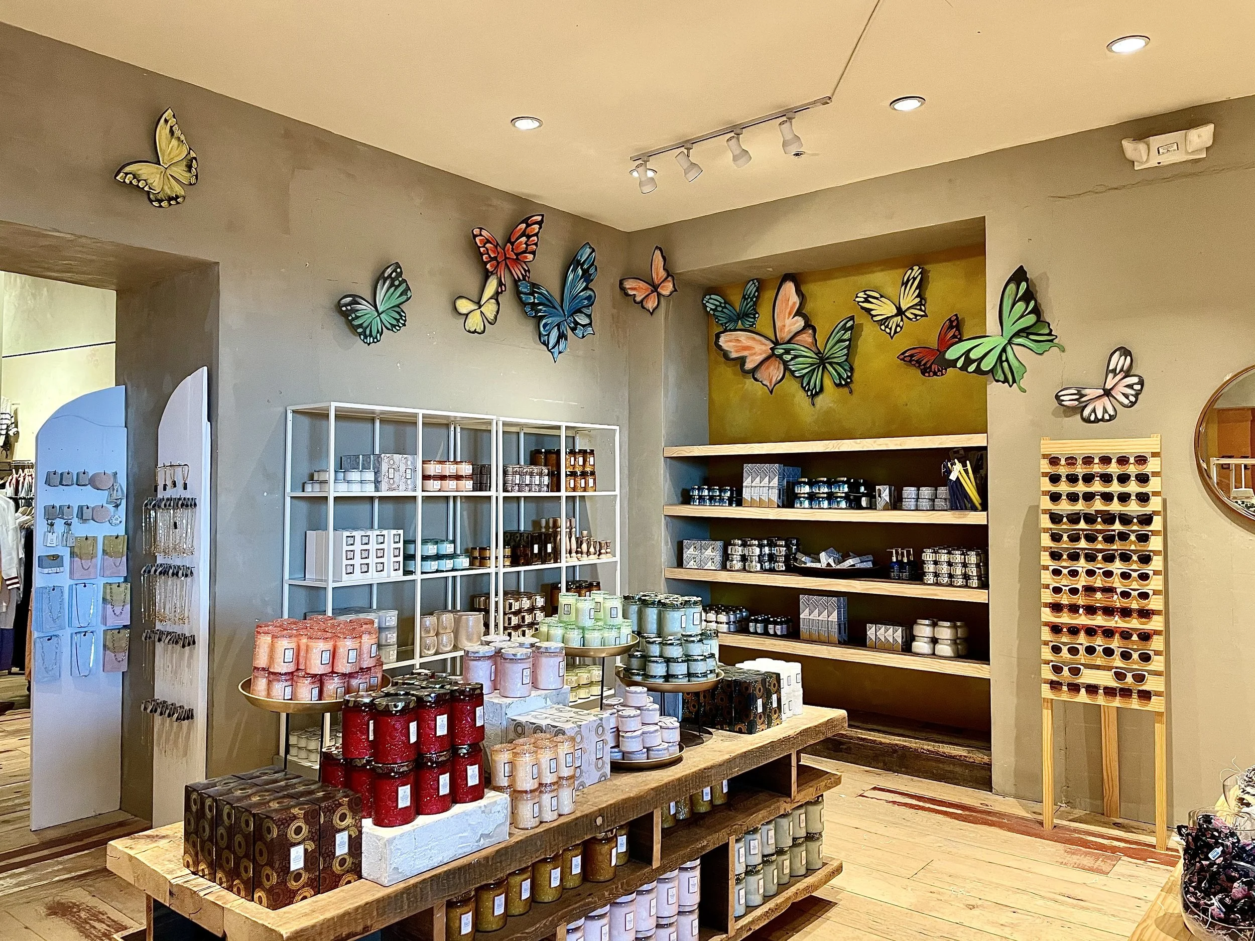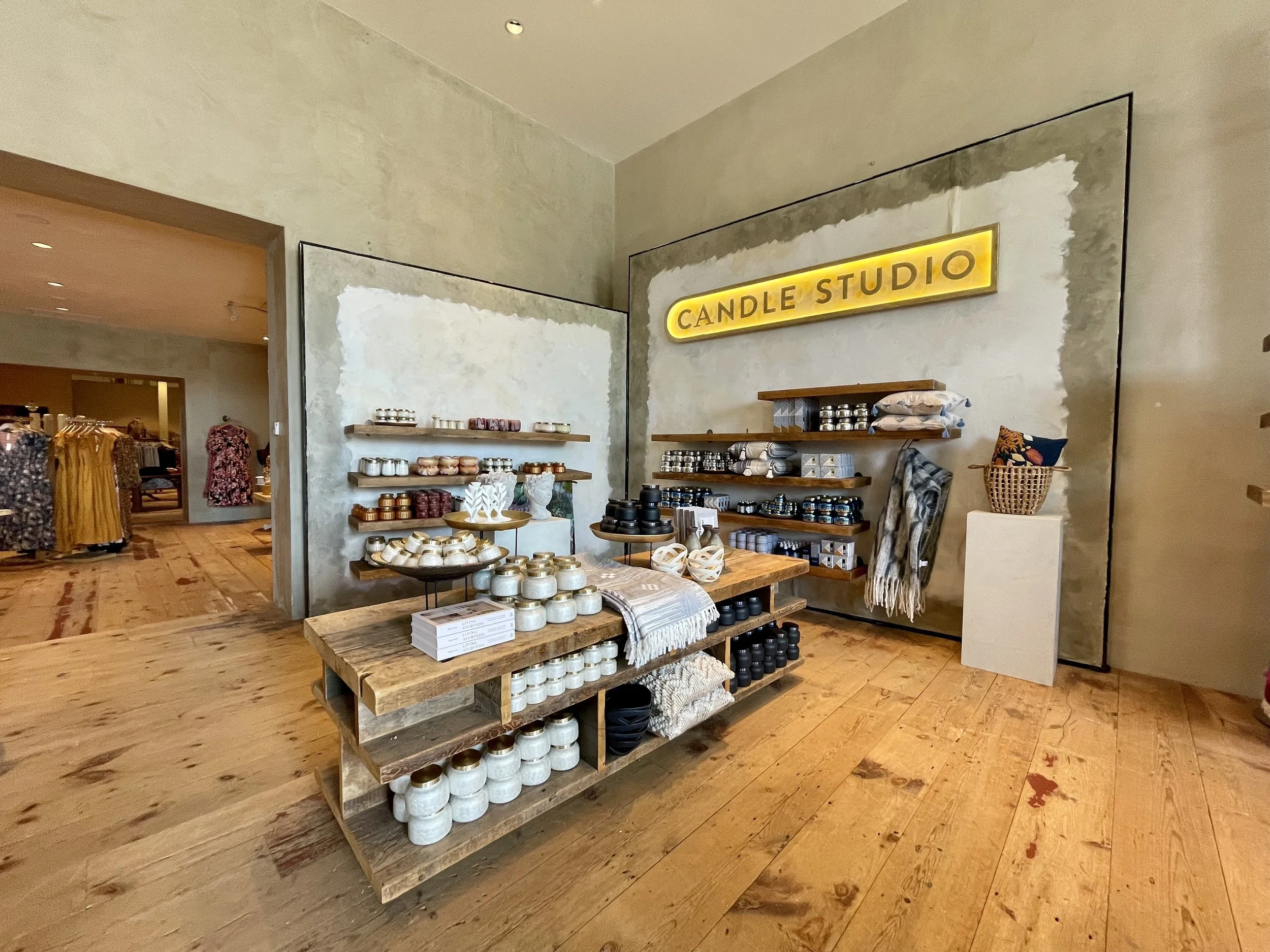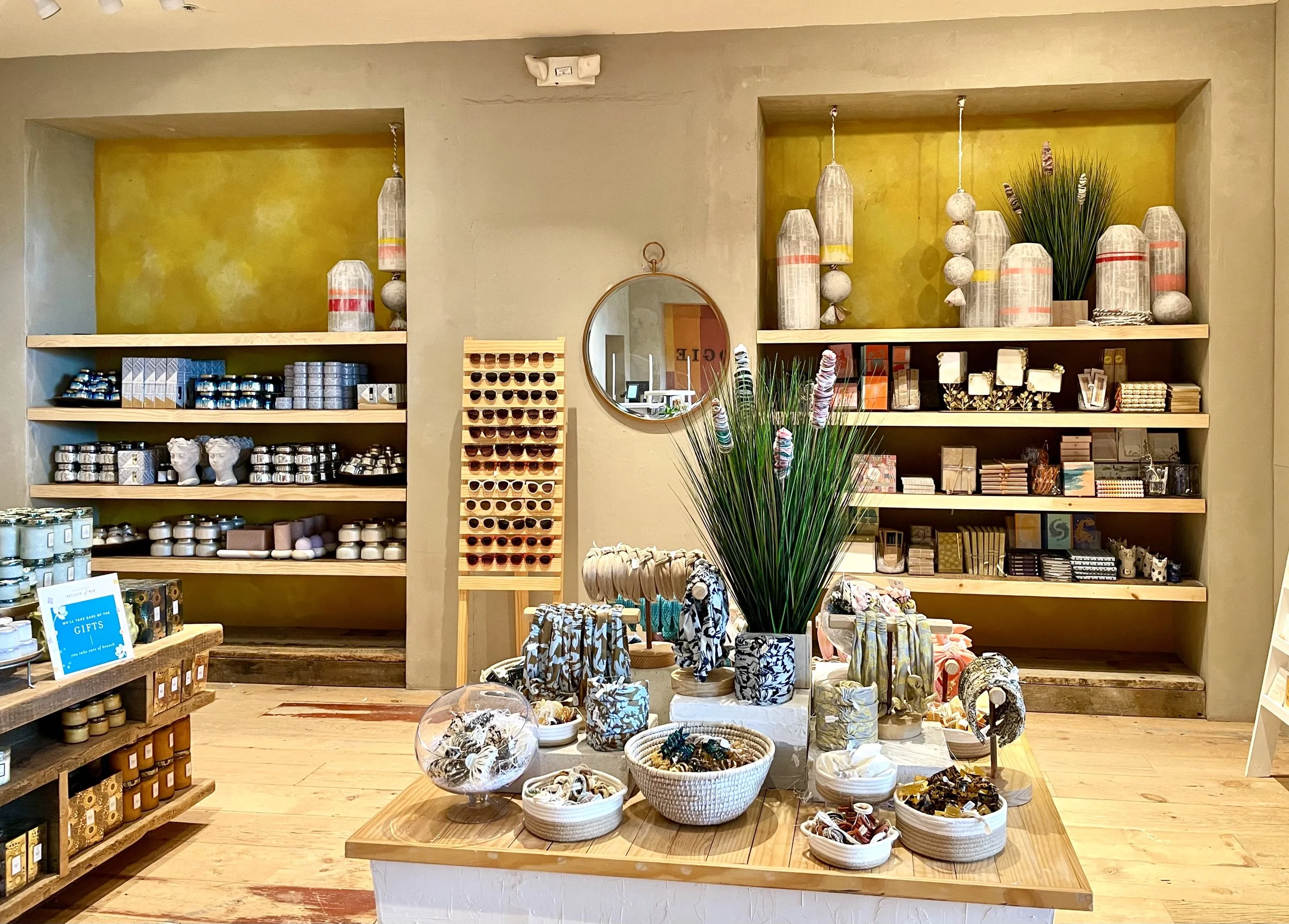 Plexi rounds, wood rounds, fabric rounds, and real dried fruit all played together to create a vibrant display inspired by sliced citrus