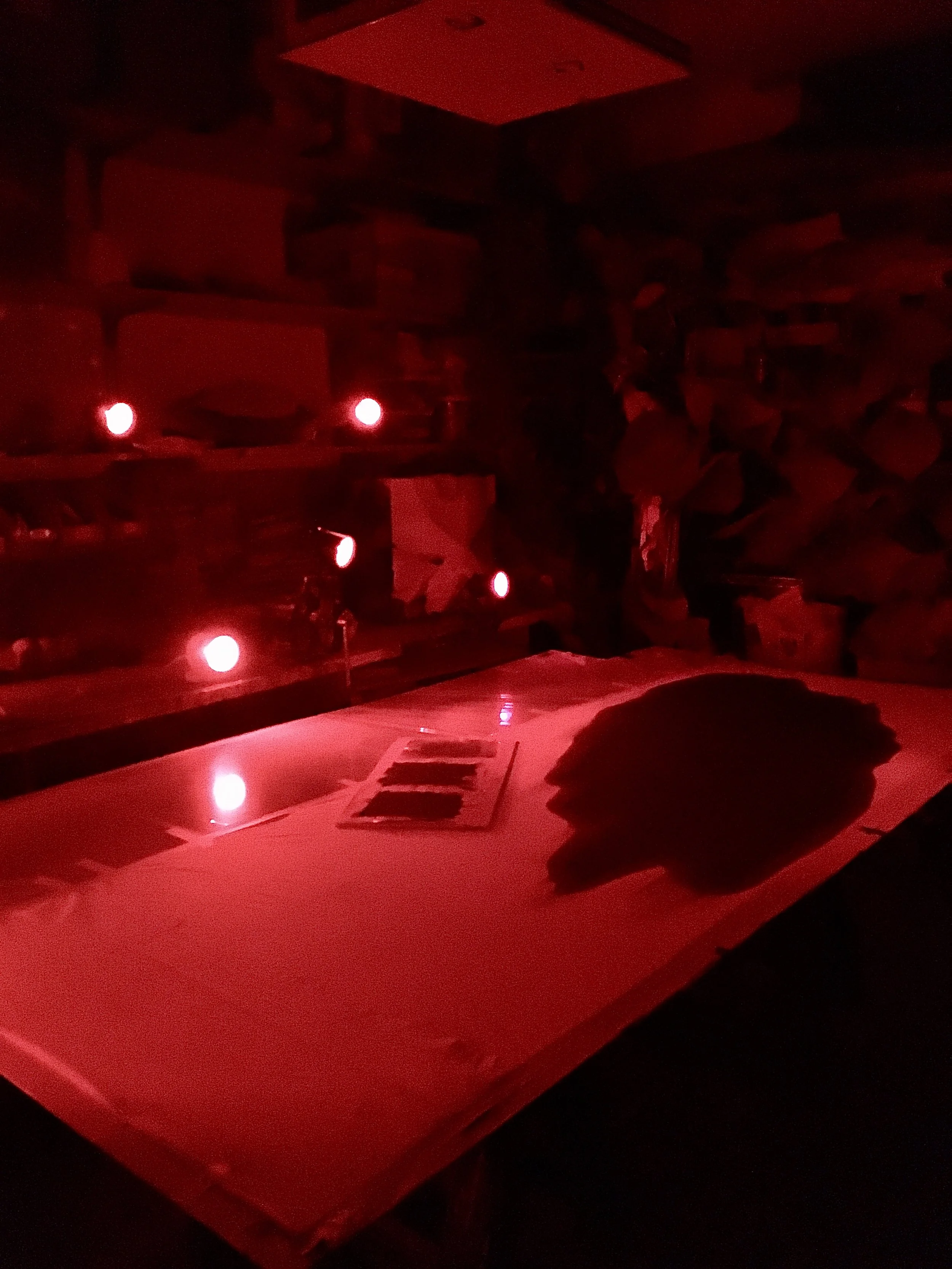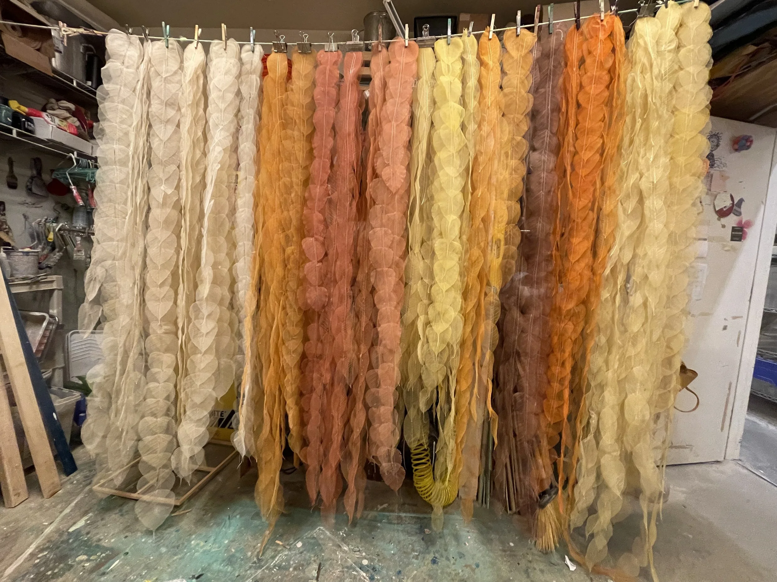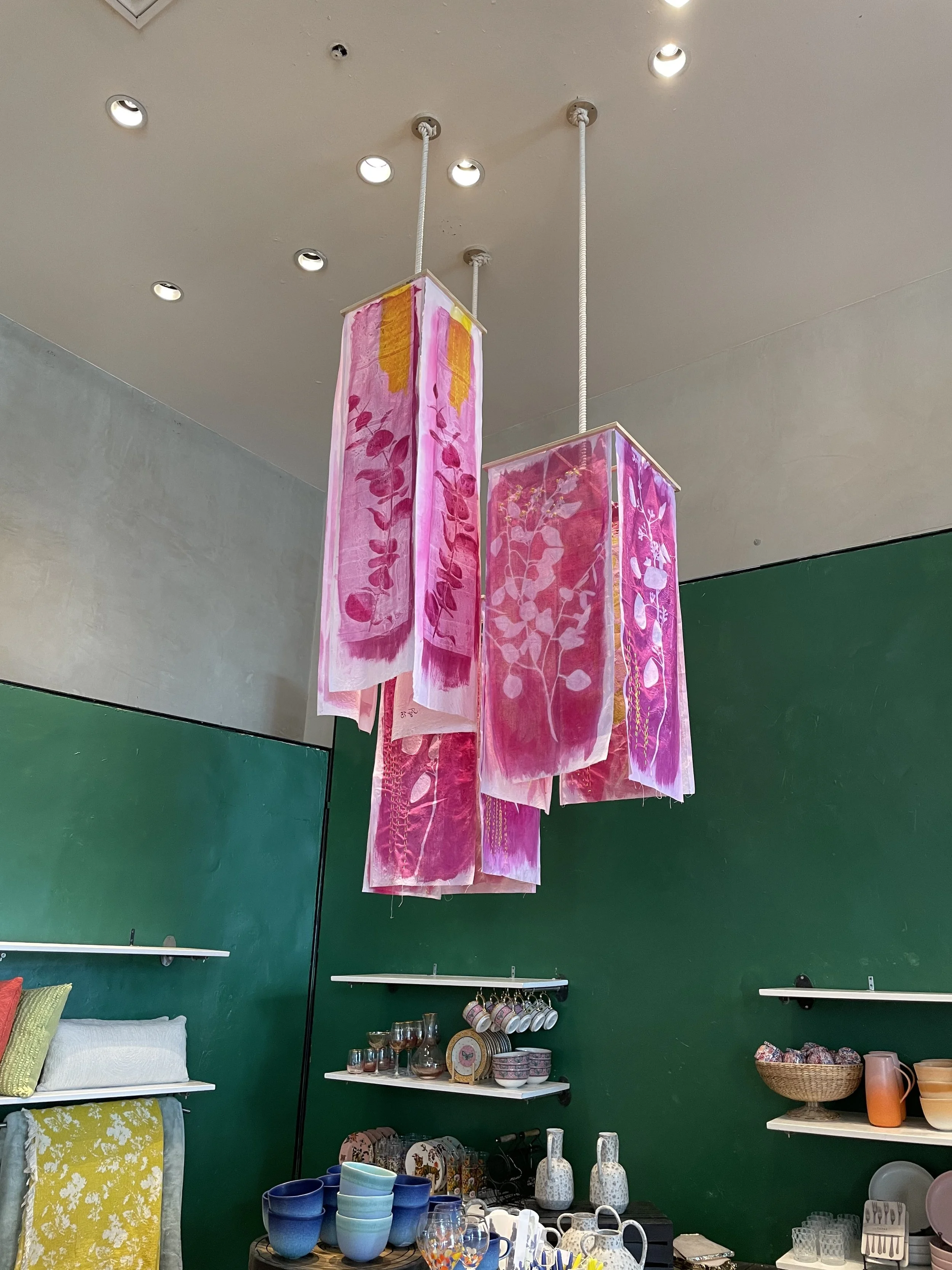 Sunprint fabric pendants with eucalyptus silhouettes and handstiched details