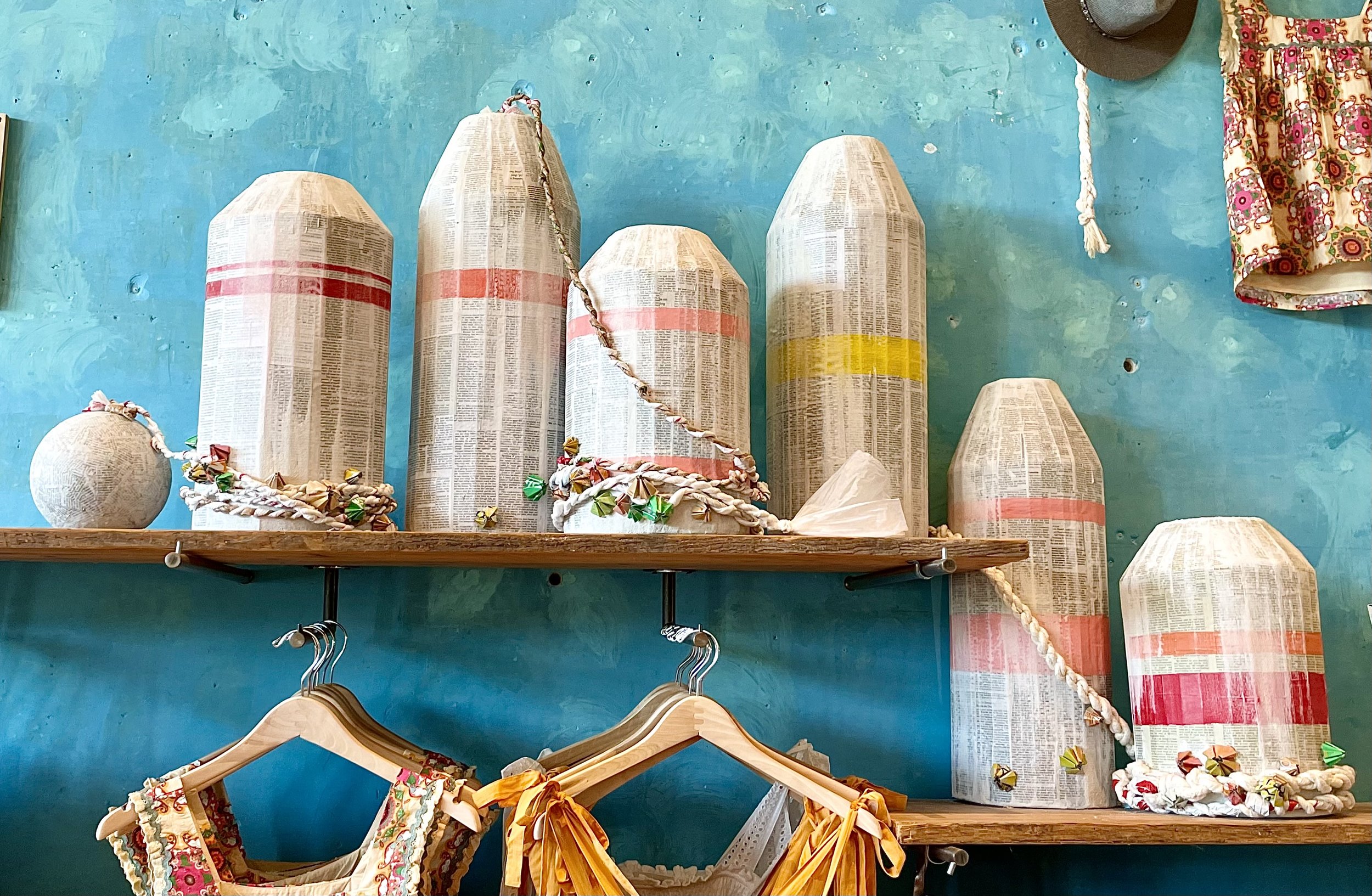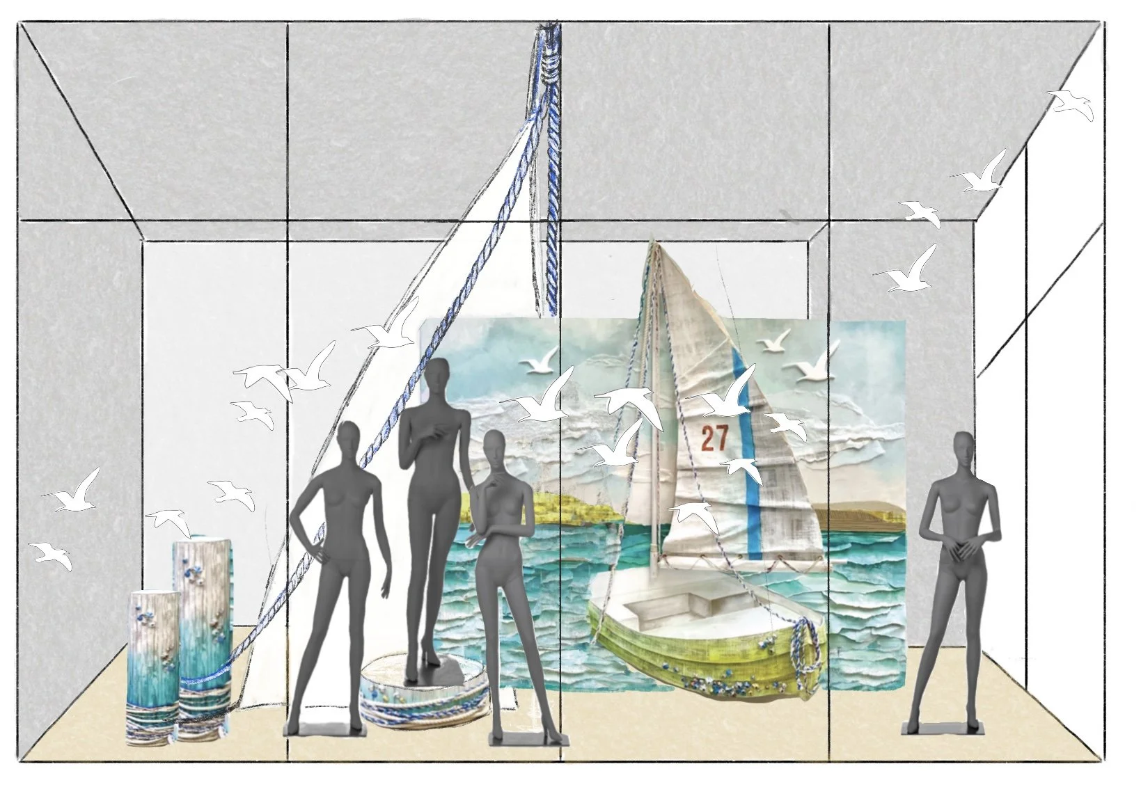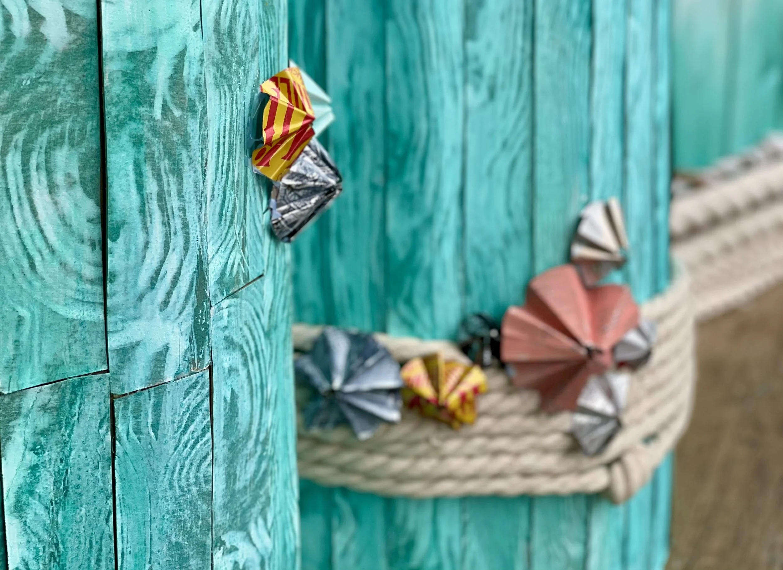 This summer window was an earth day installation, made mostly from what was once garbage. Recycled soda cans, plastic bags, newspapers, magazines, cardboard, Styrofoam, and bubble wrap all payed a part in creating this beach scene.