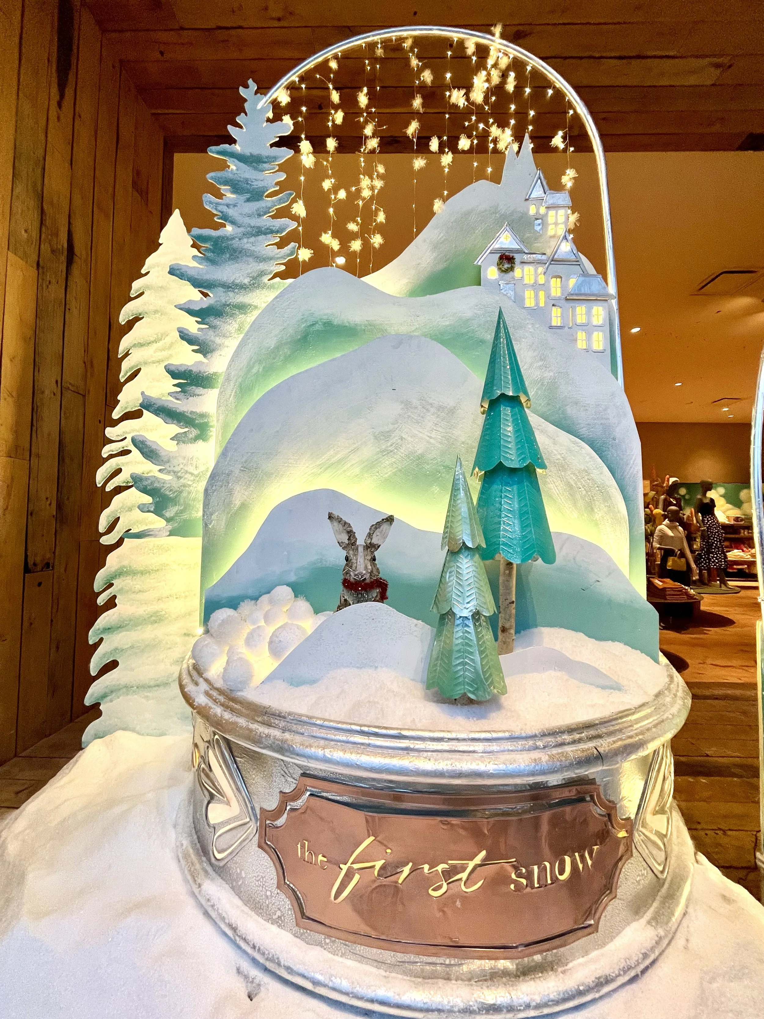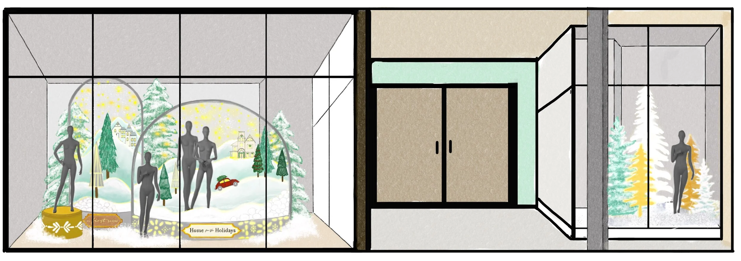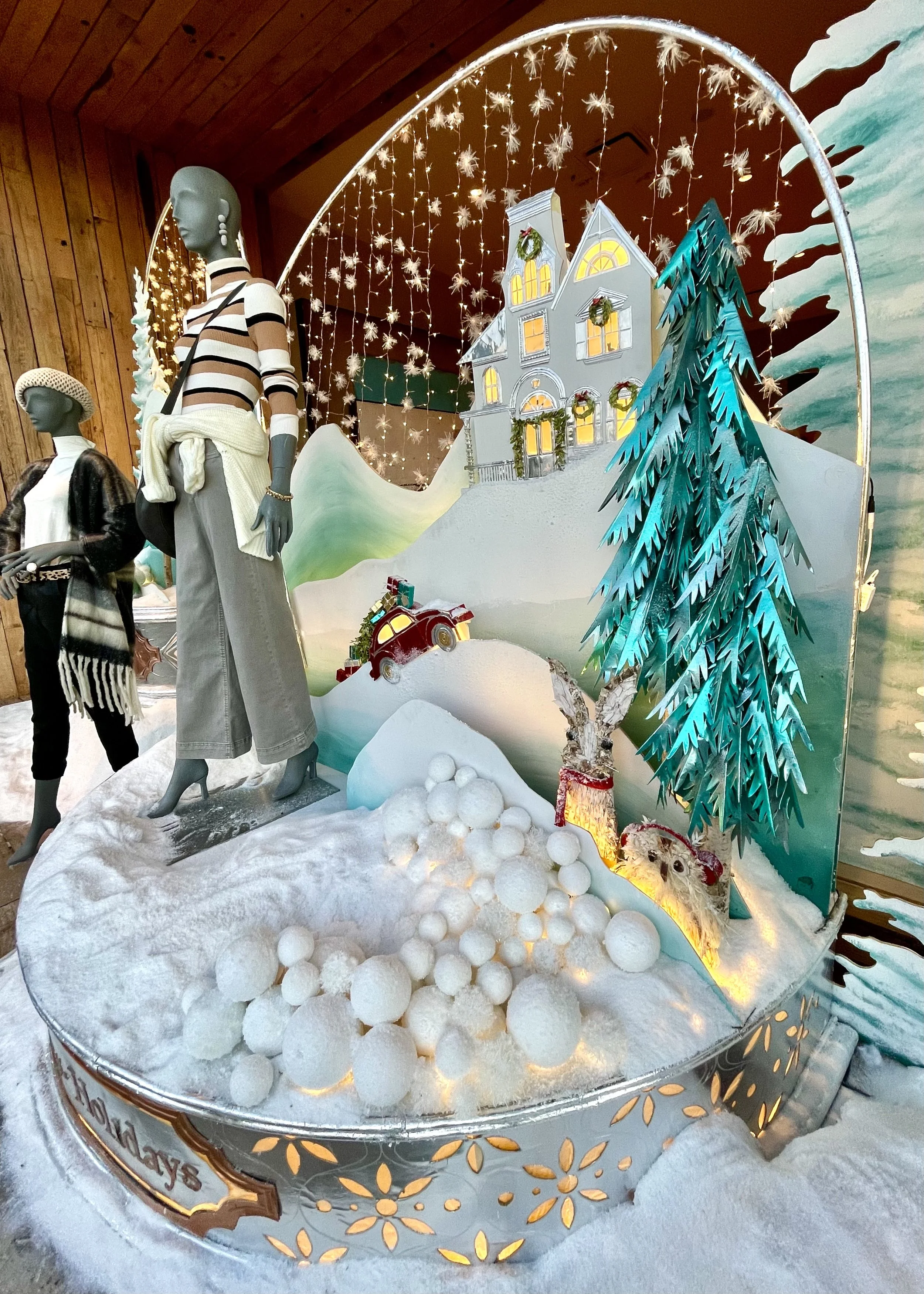 This holiday season, the windows showcased large-scale, abstracted snow globe structures, featuring metallic trees, and a charming snowscape scene all lit from within to create a glow in every single element. The scene created embodies the feeling of being home for the holidays.