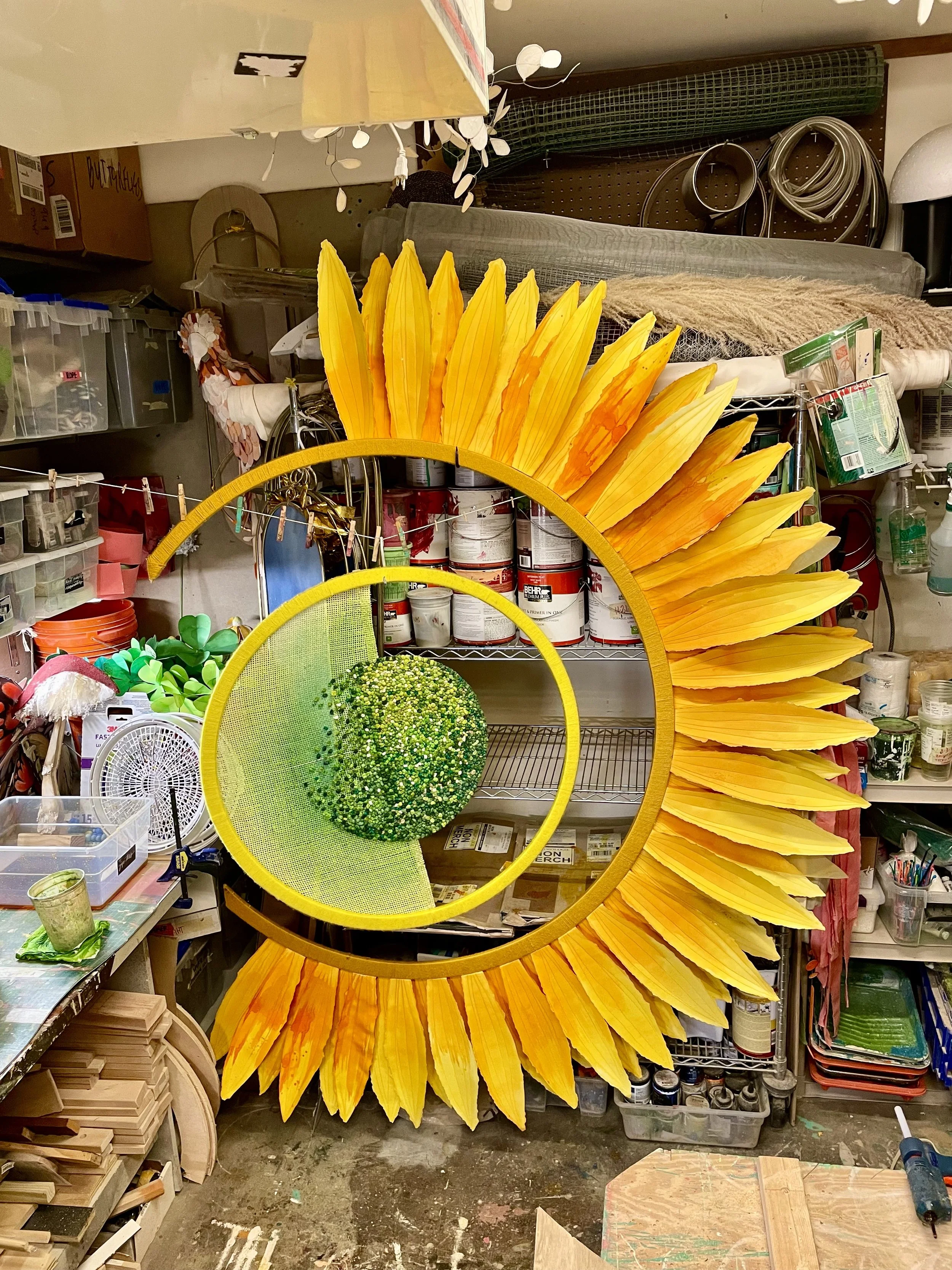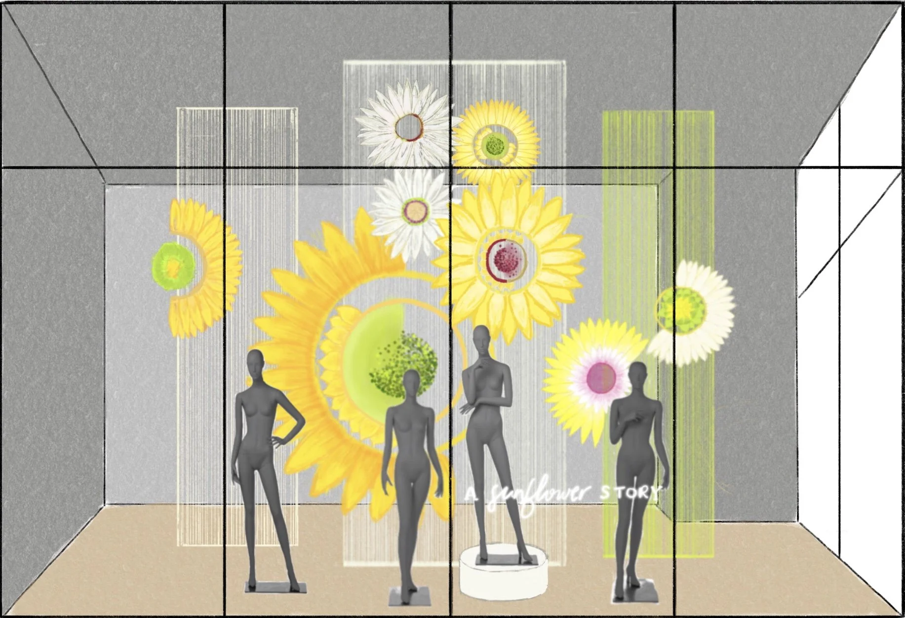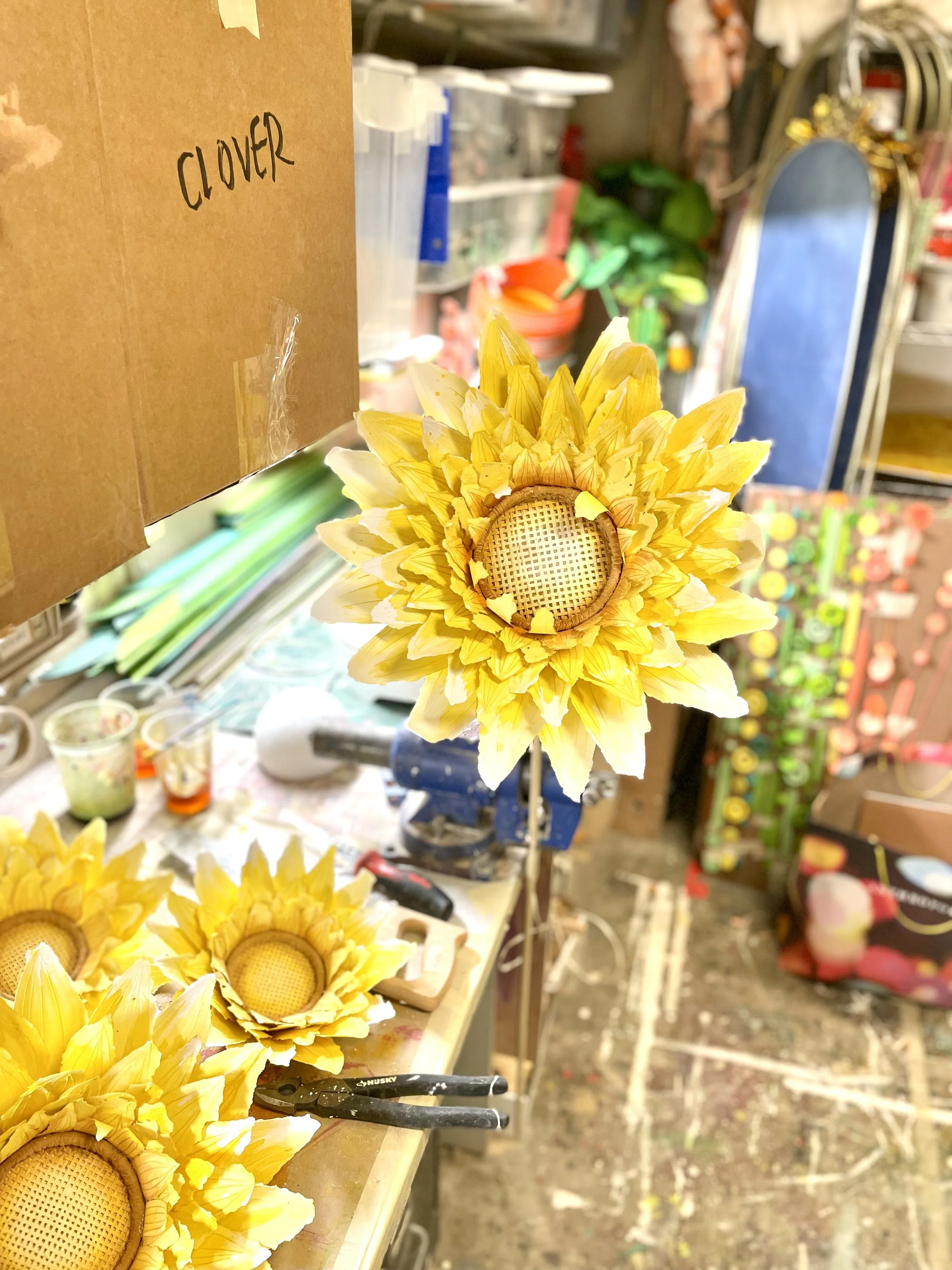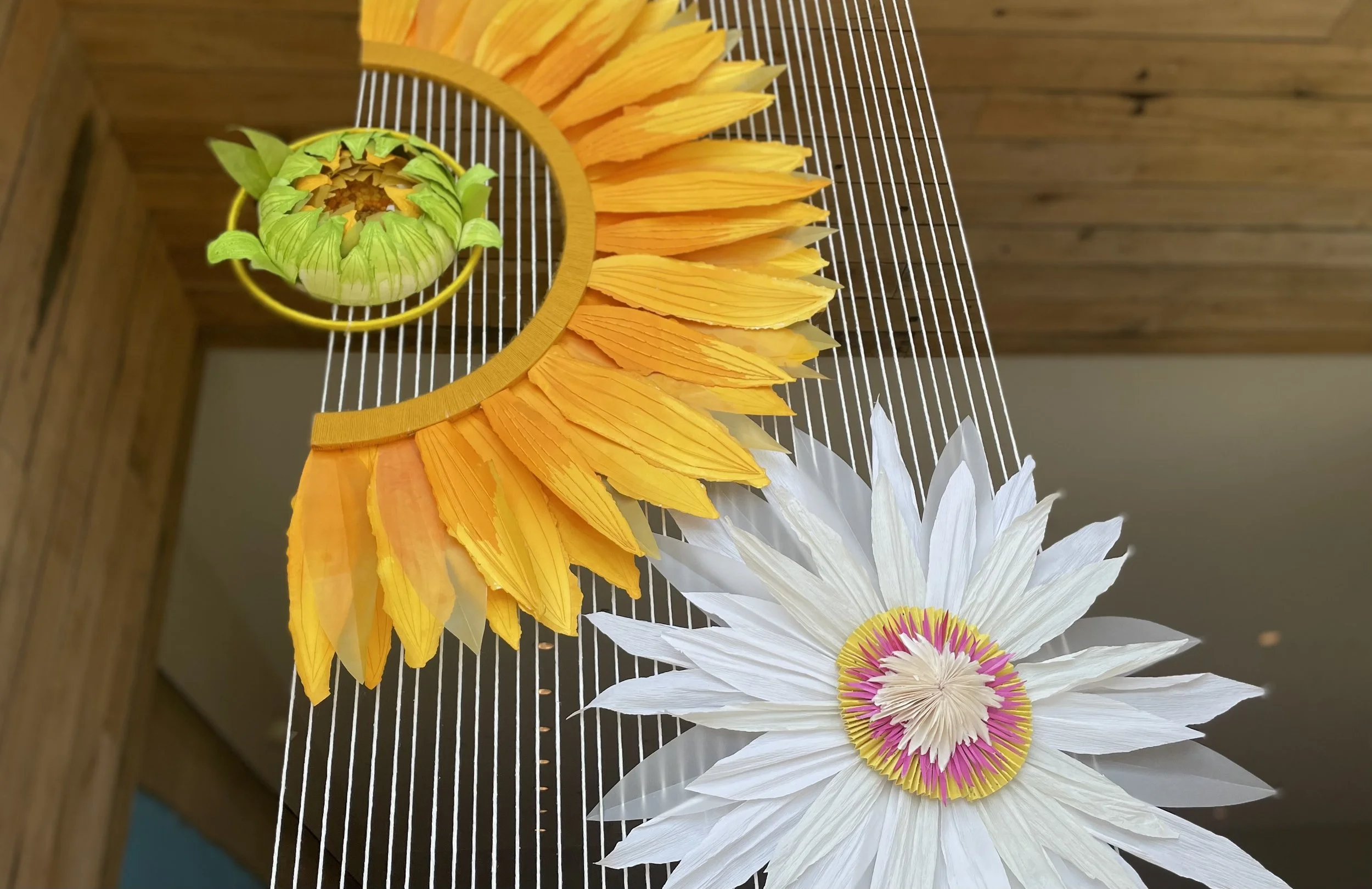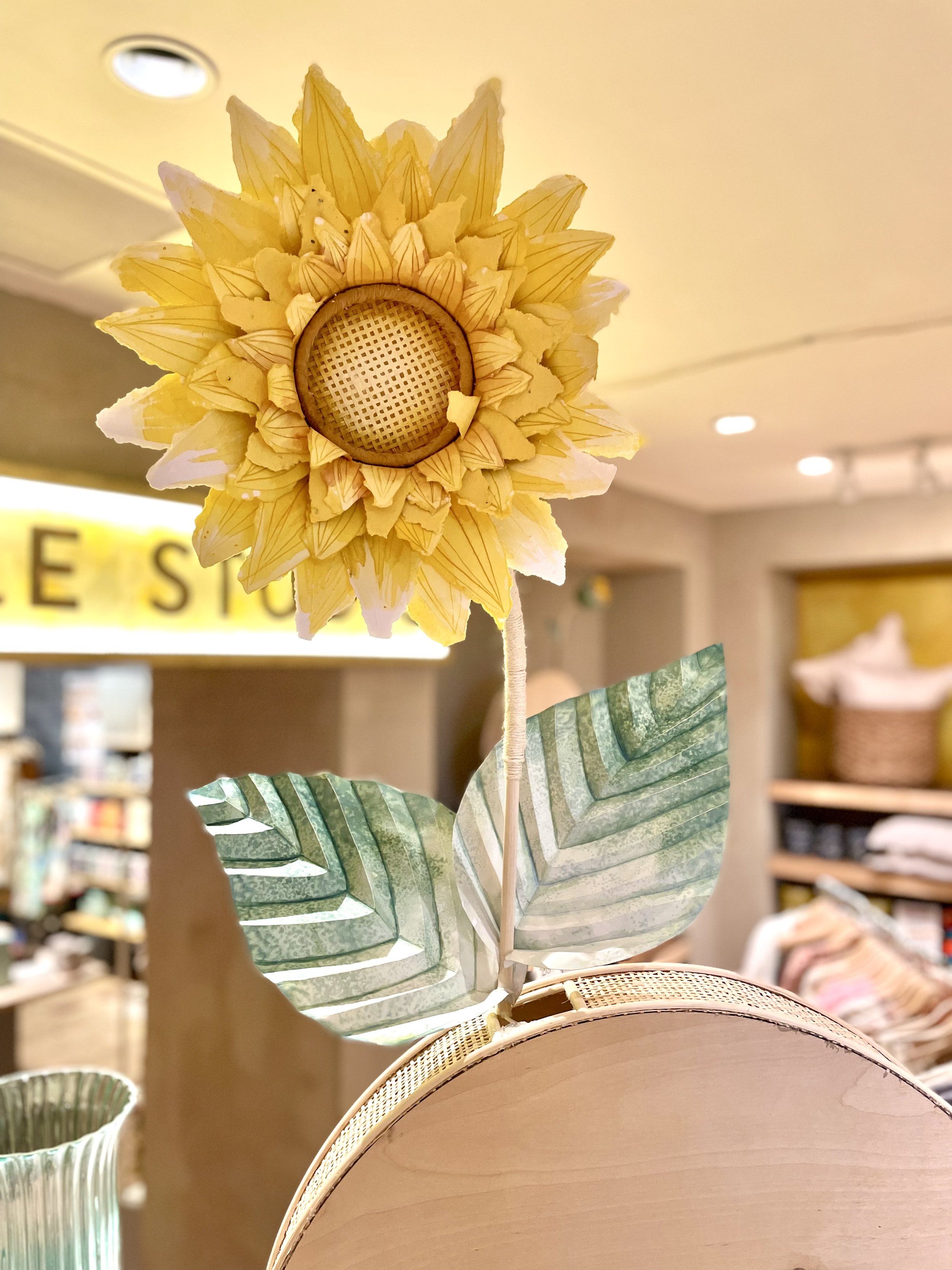 This summer window was an earth day installation, featuring large mixed media sunflowers with intricate centers. the materials were carefully selected with a focus on sustainability and a natural feel. They were made from an assortment of papers, rope, twine, wood, natural dyes, and seed paper.