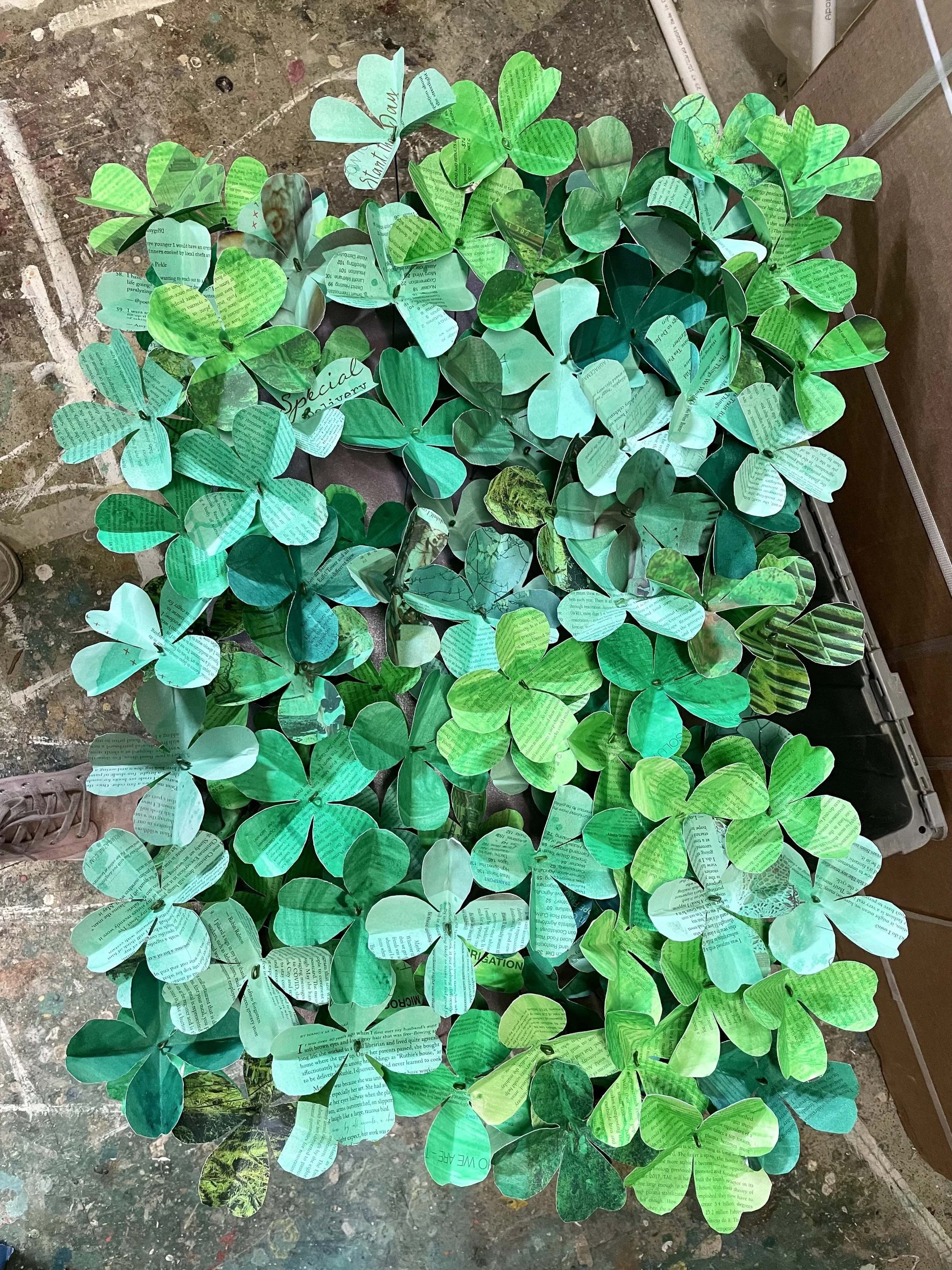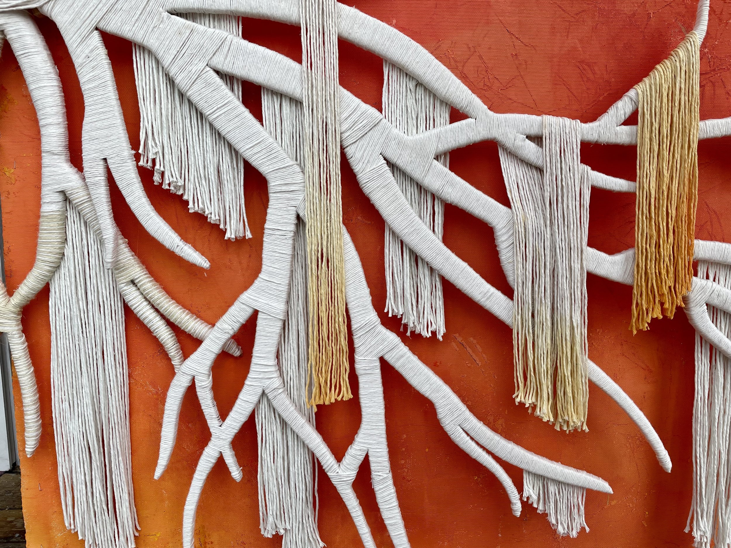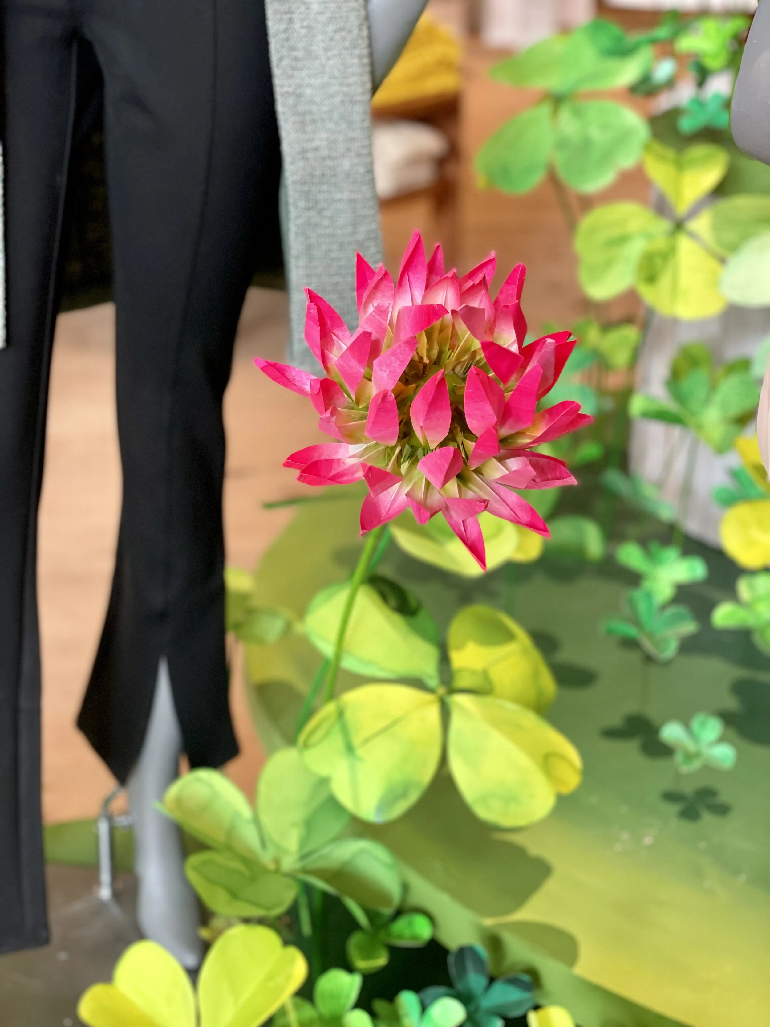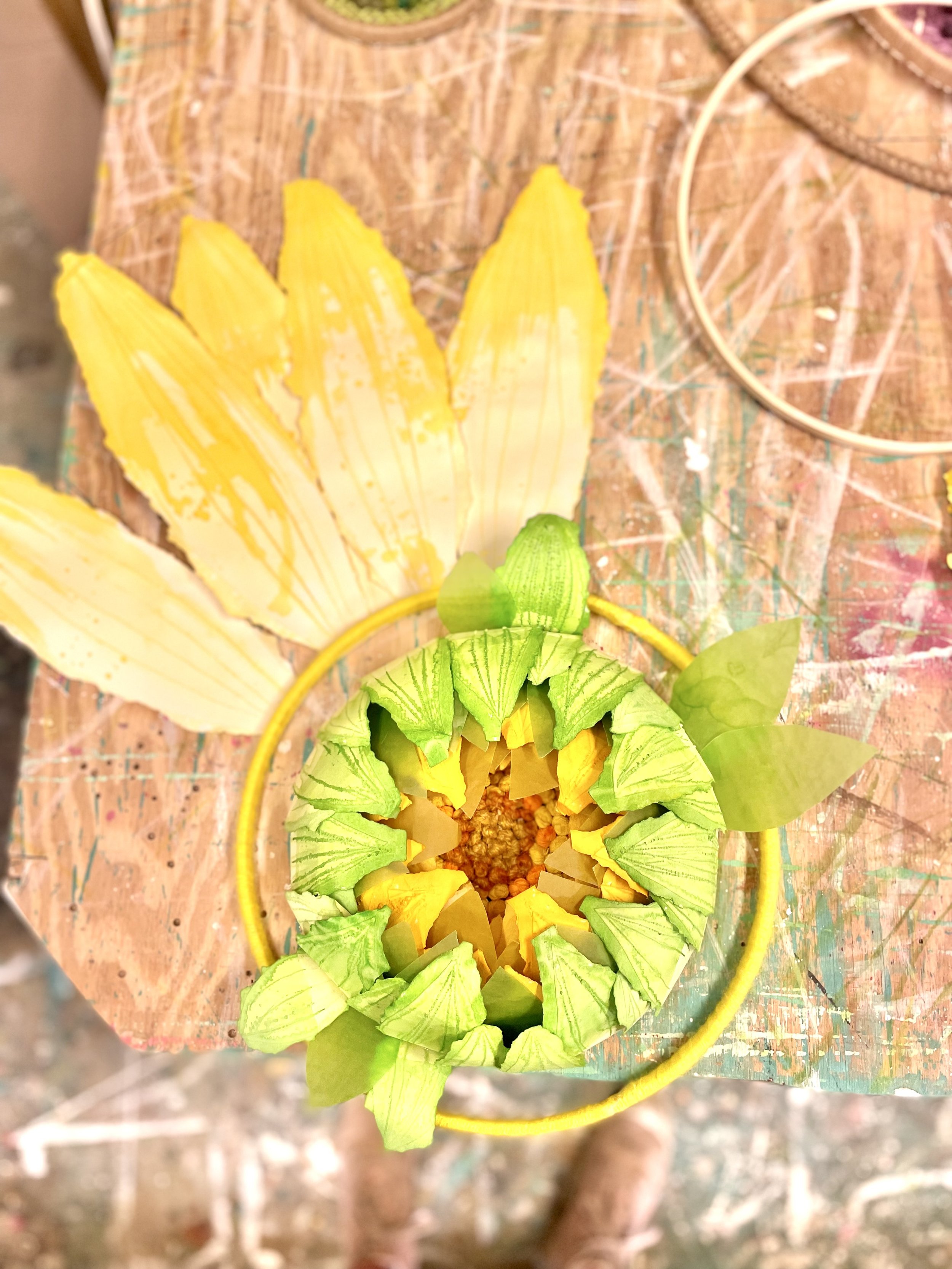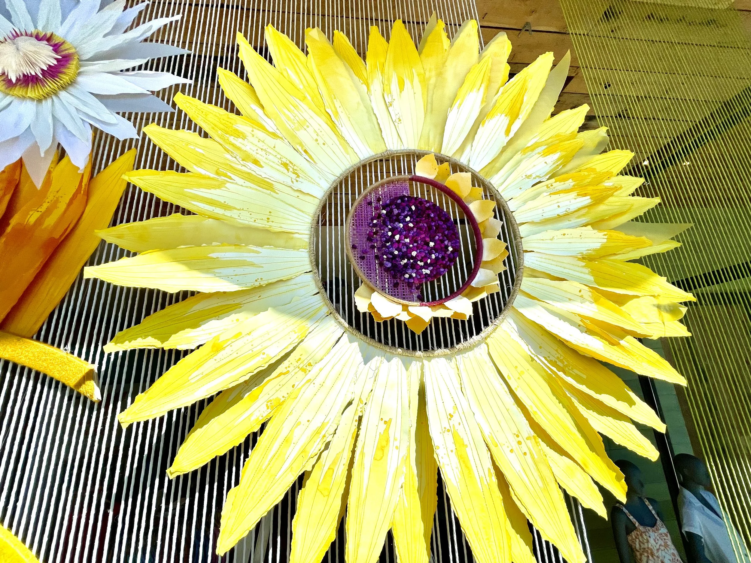 This summer window was an earth day installation, featuring large mixed media sunflowers with intricate centers. the materials were carefully selected with a focus on sustainability and a natural feel. They were made from an assortment of papers, rope, twine, wood, natural dyes, and seed paper.