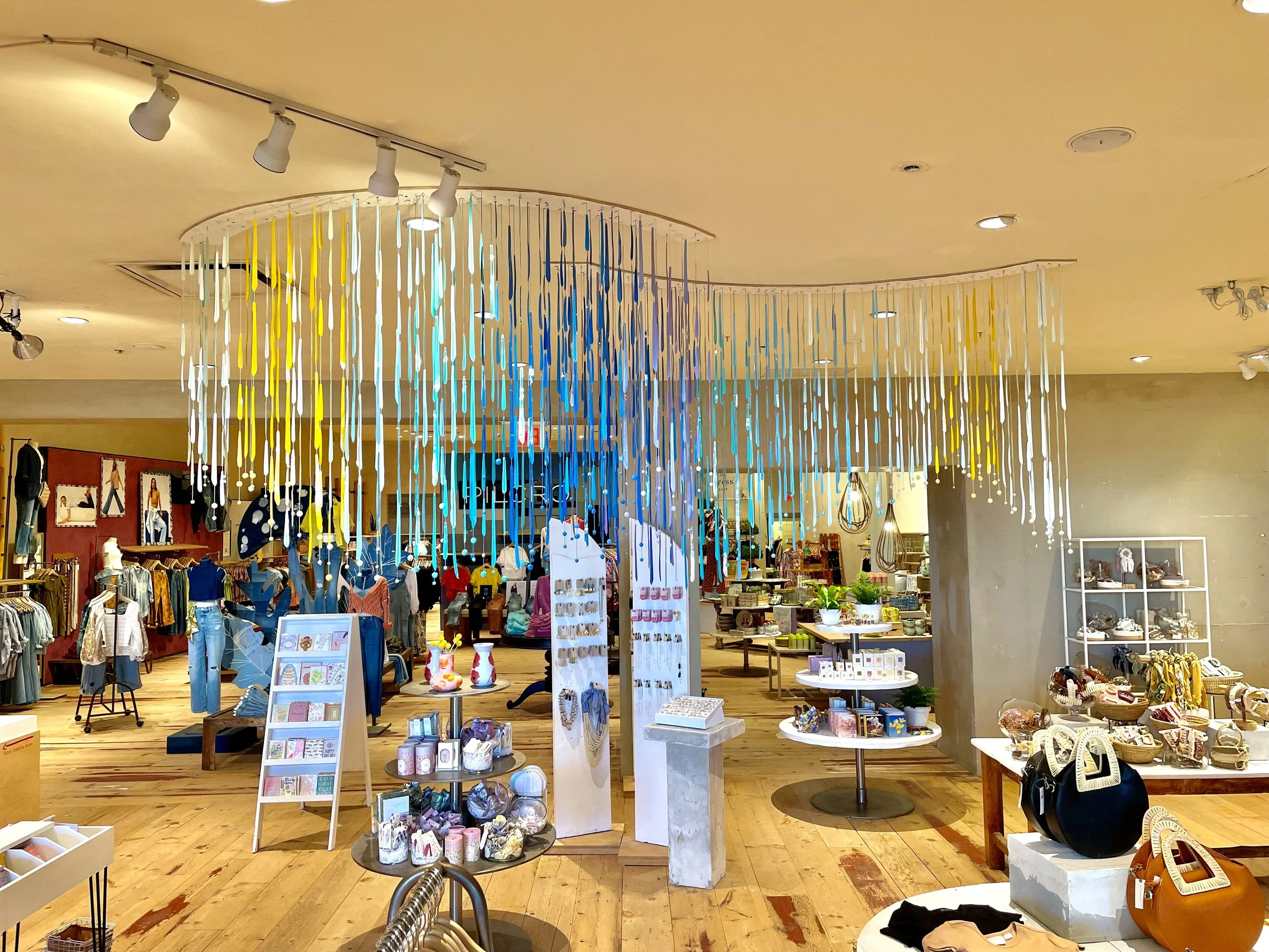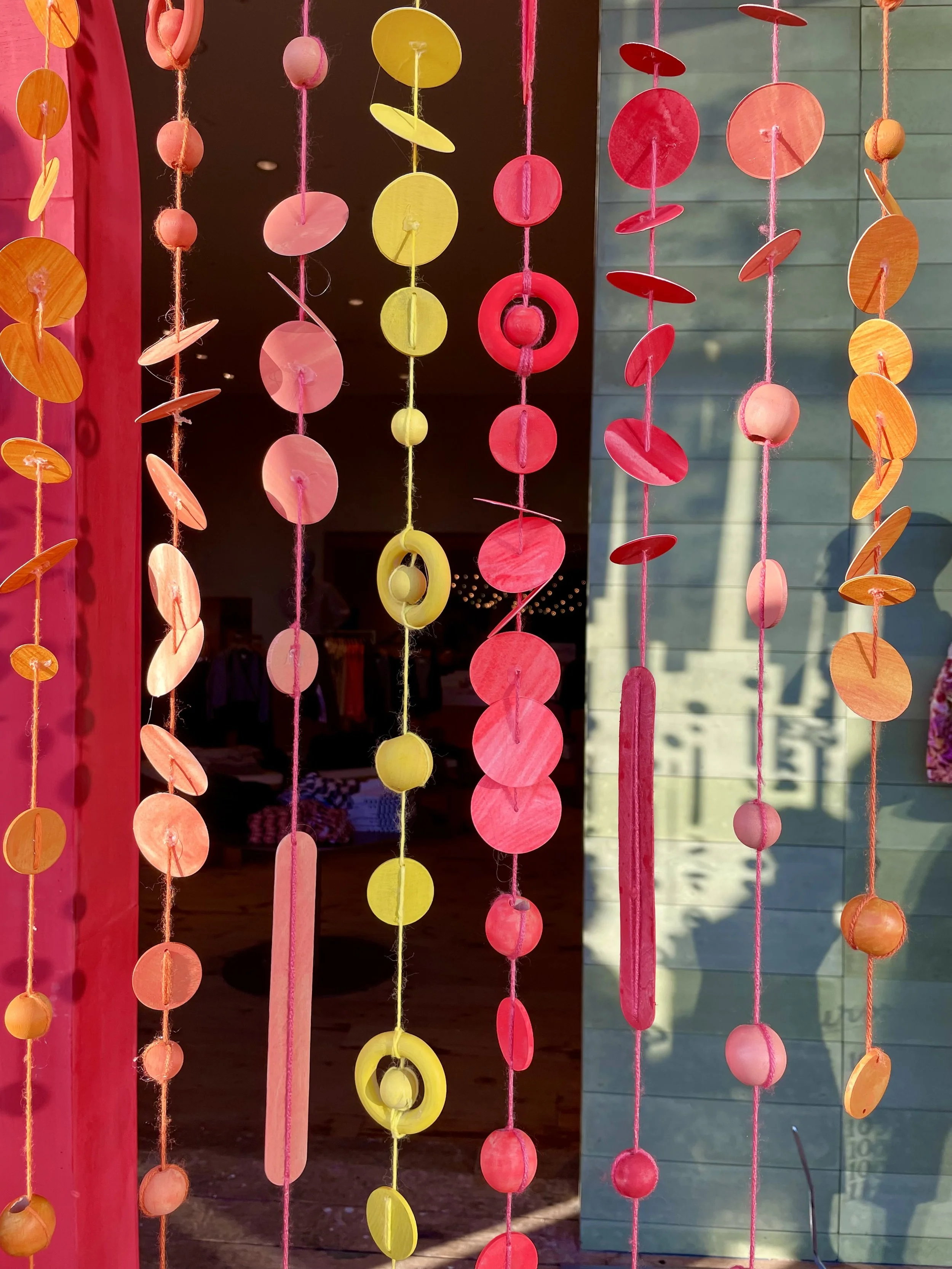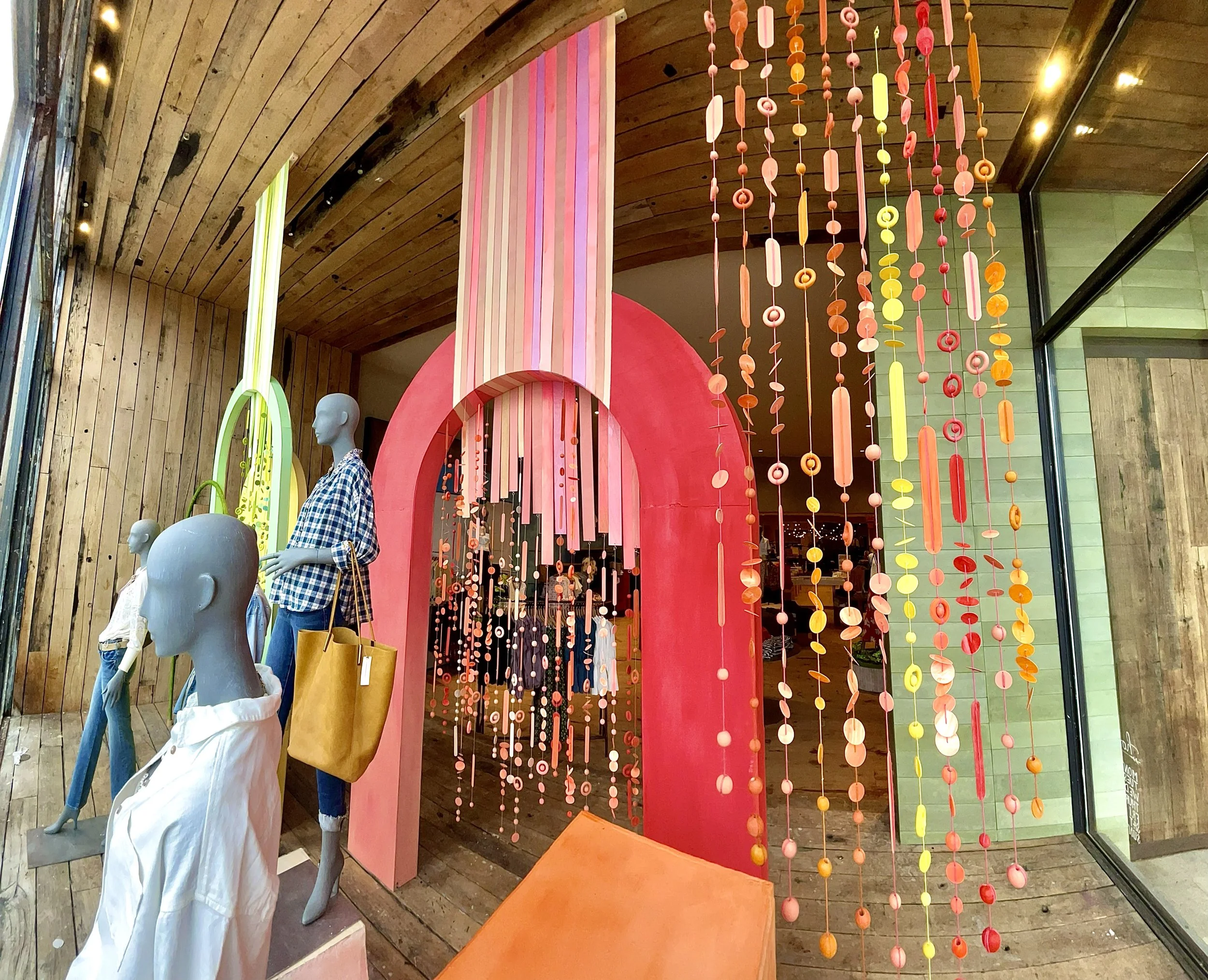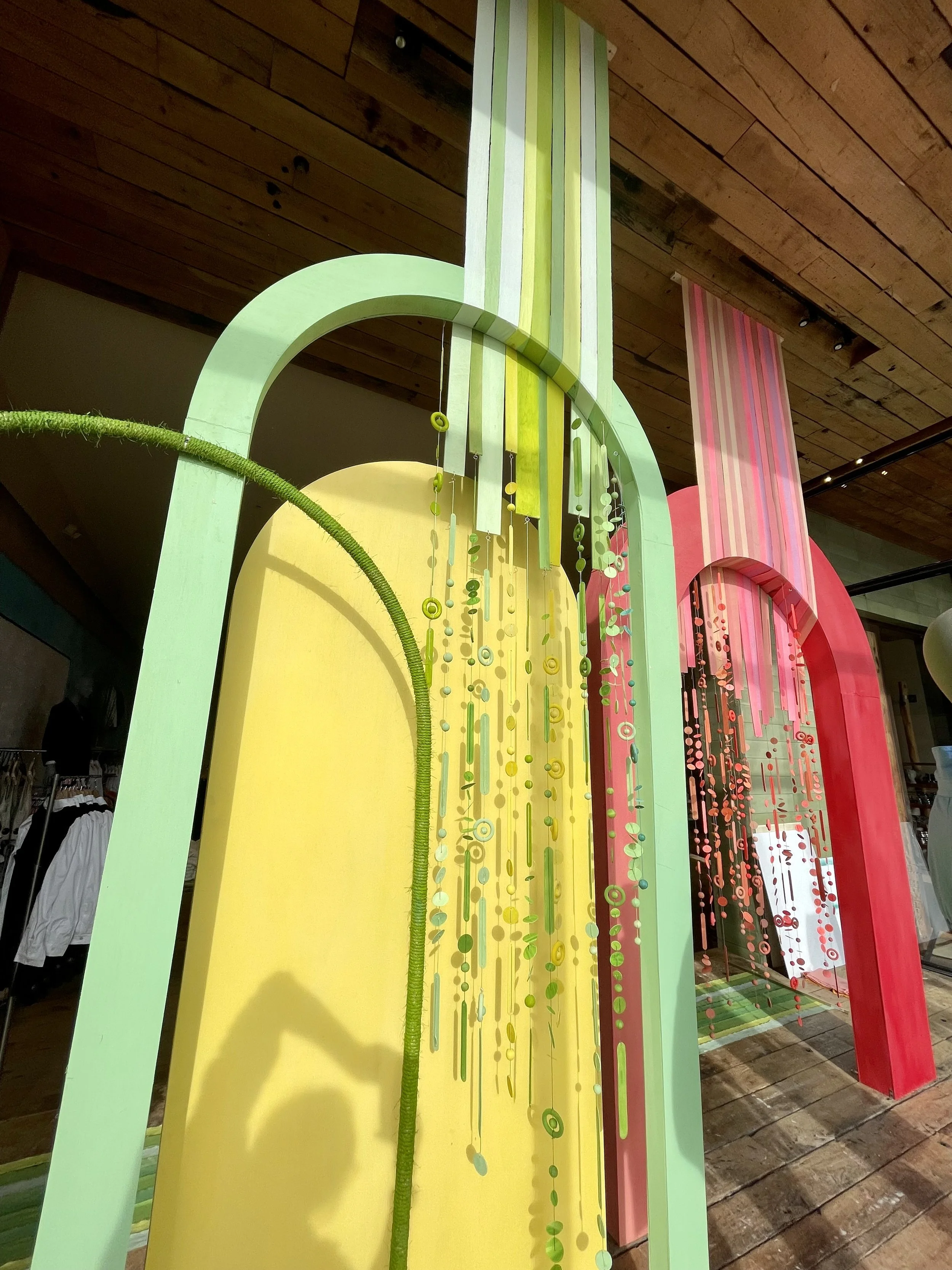 This season's spring windows were a celebration of rainbows! Large, colorful arcs were accented with dyed fabric strips and strings of hand-painted wooden beads & shapes.