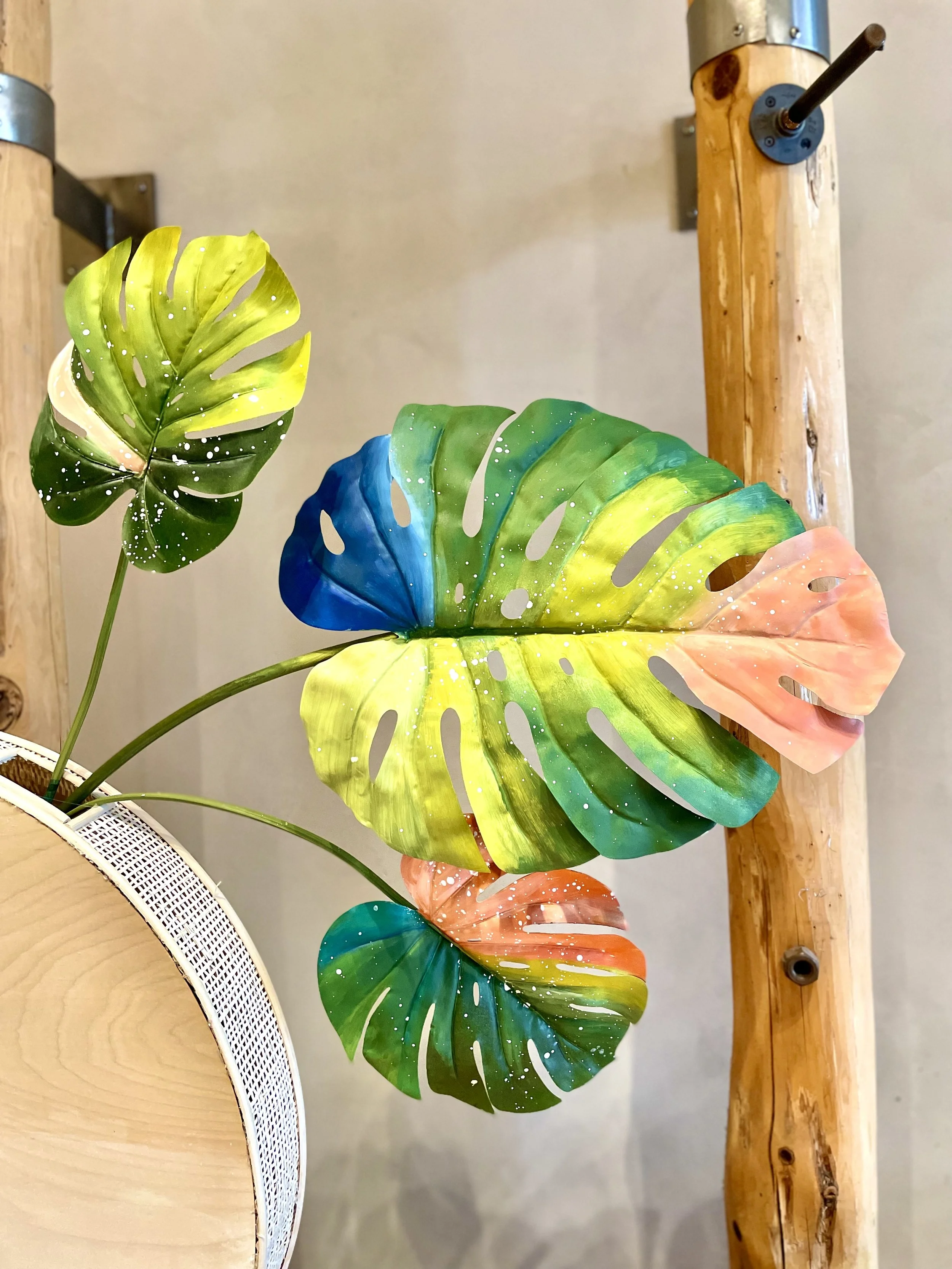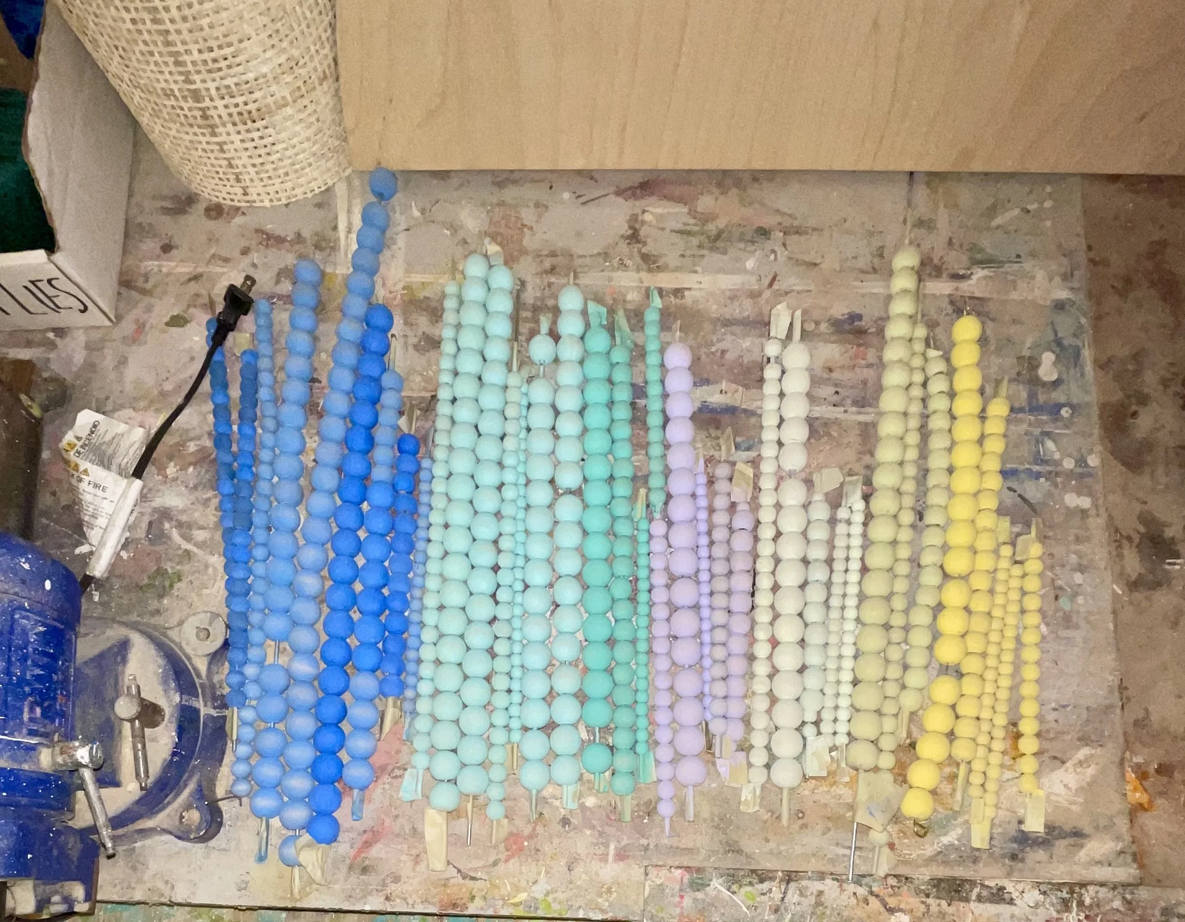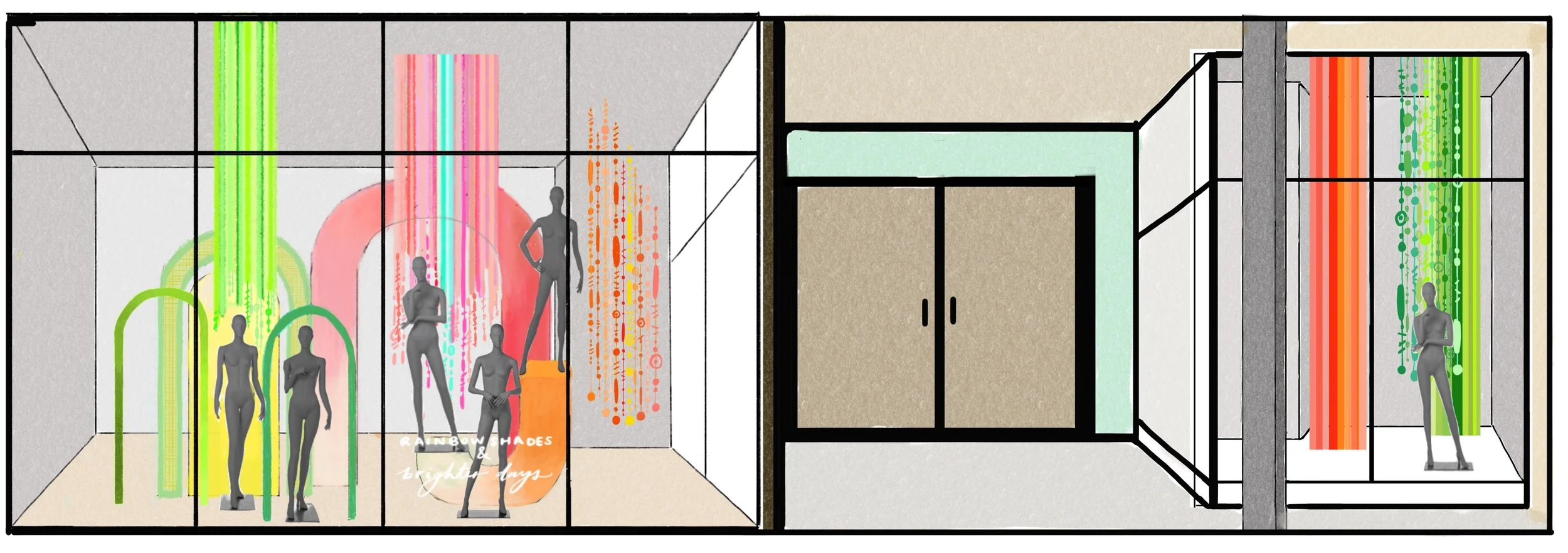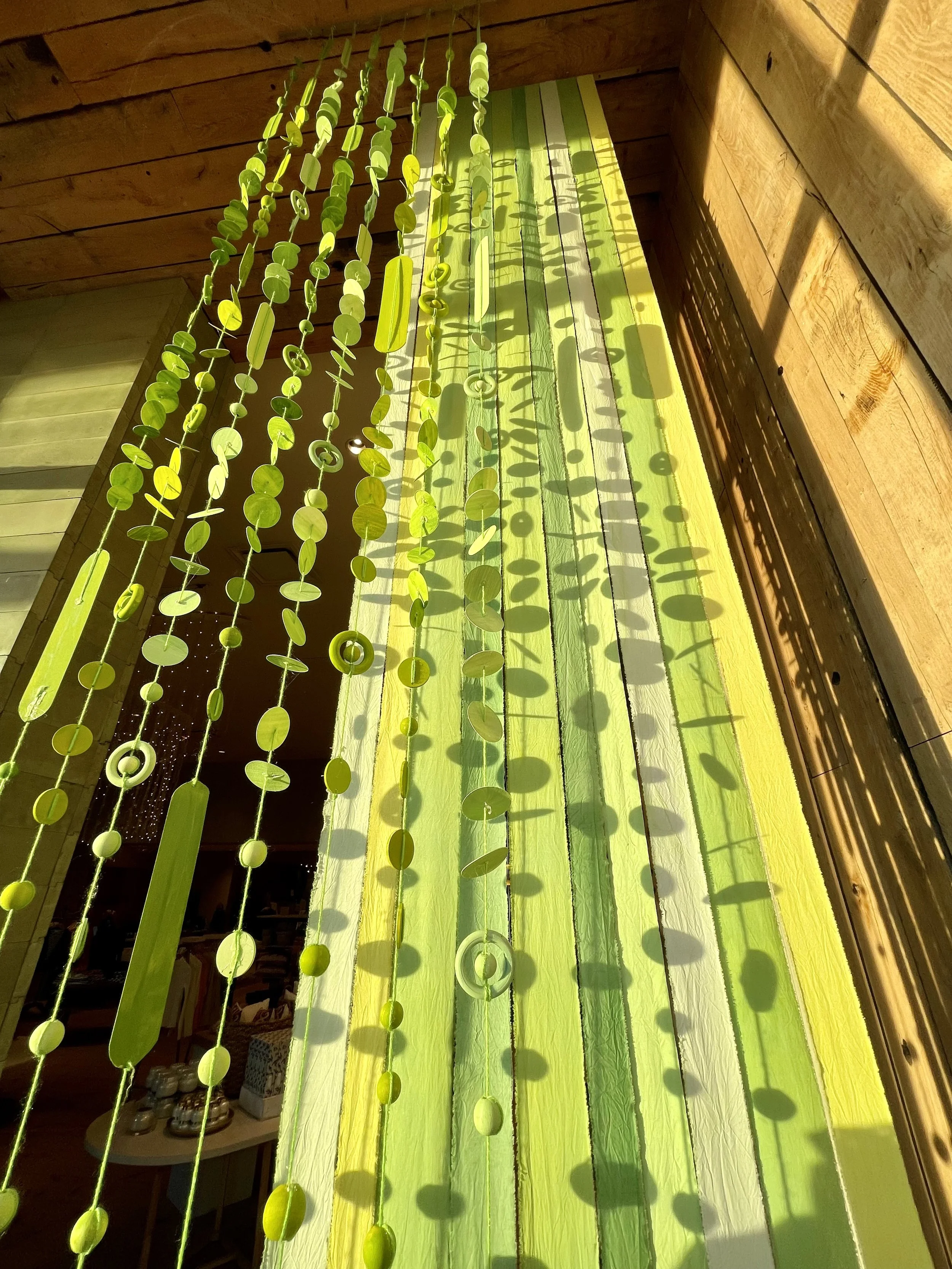 This season's spring windows were a celebration of rainbows! Large, colorful arcs were accented with dyed fabric strips and strings of hand-painted wooden beads & shapes.