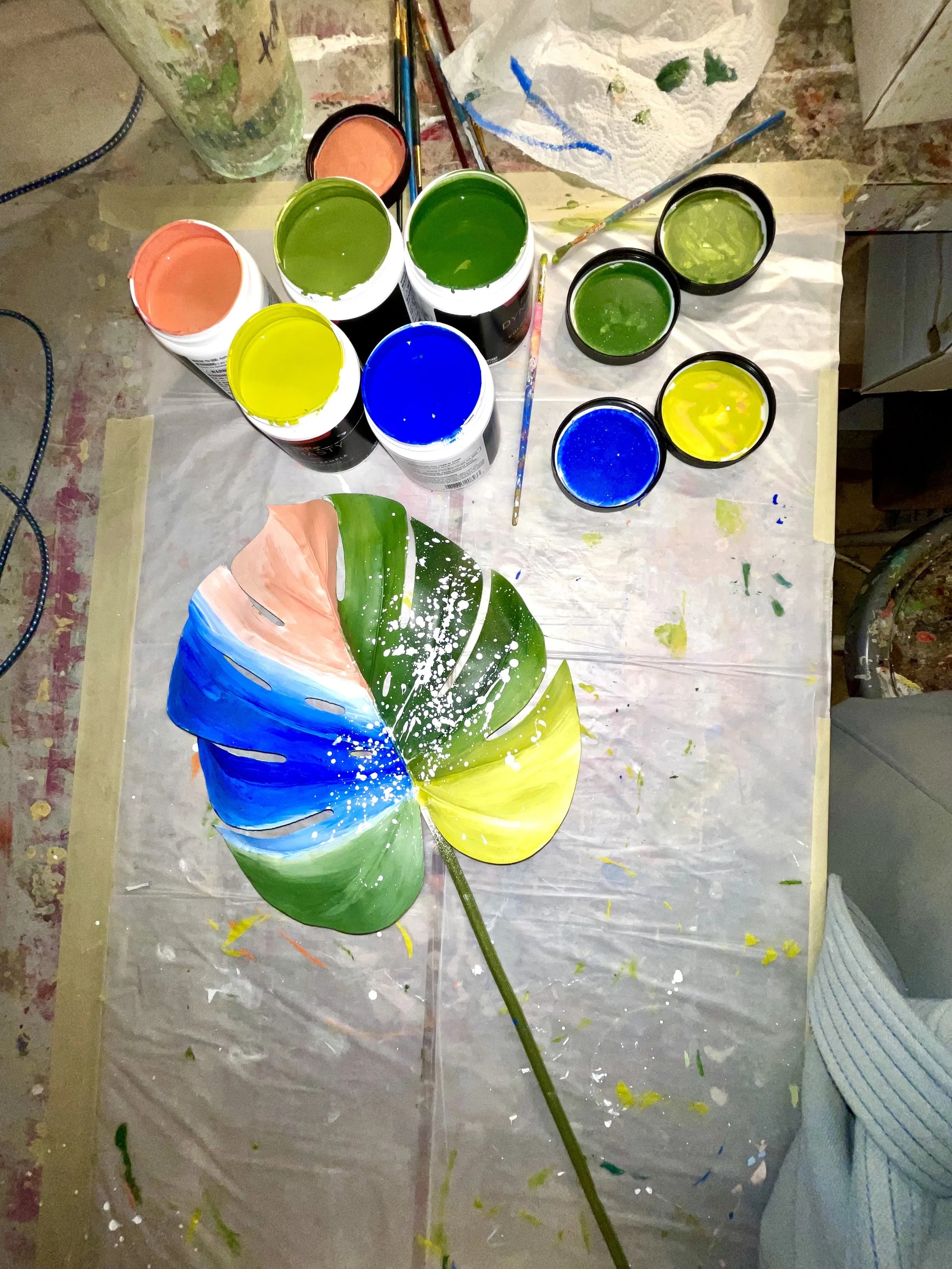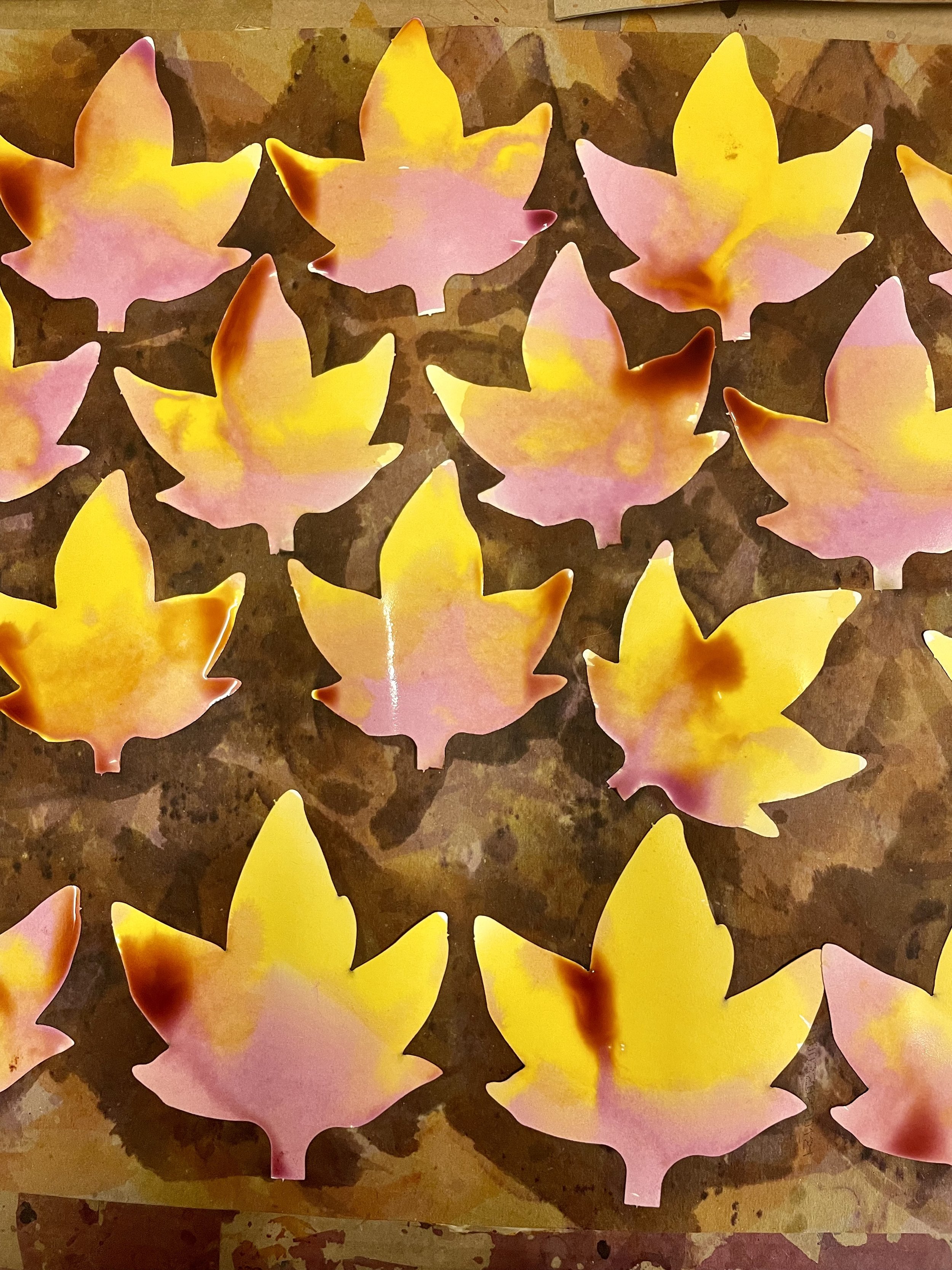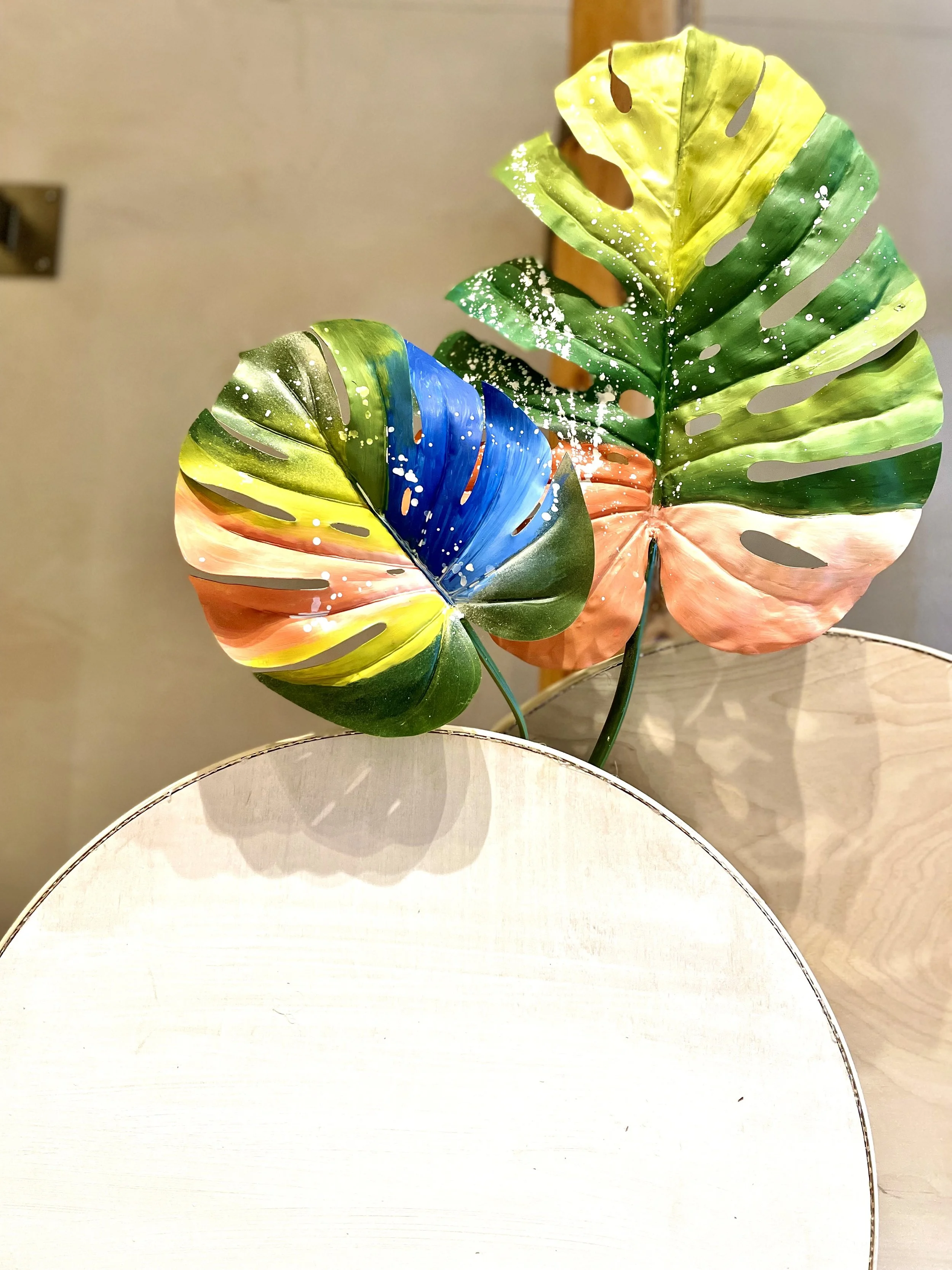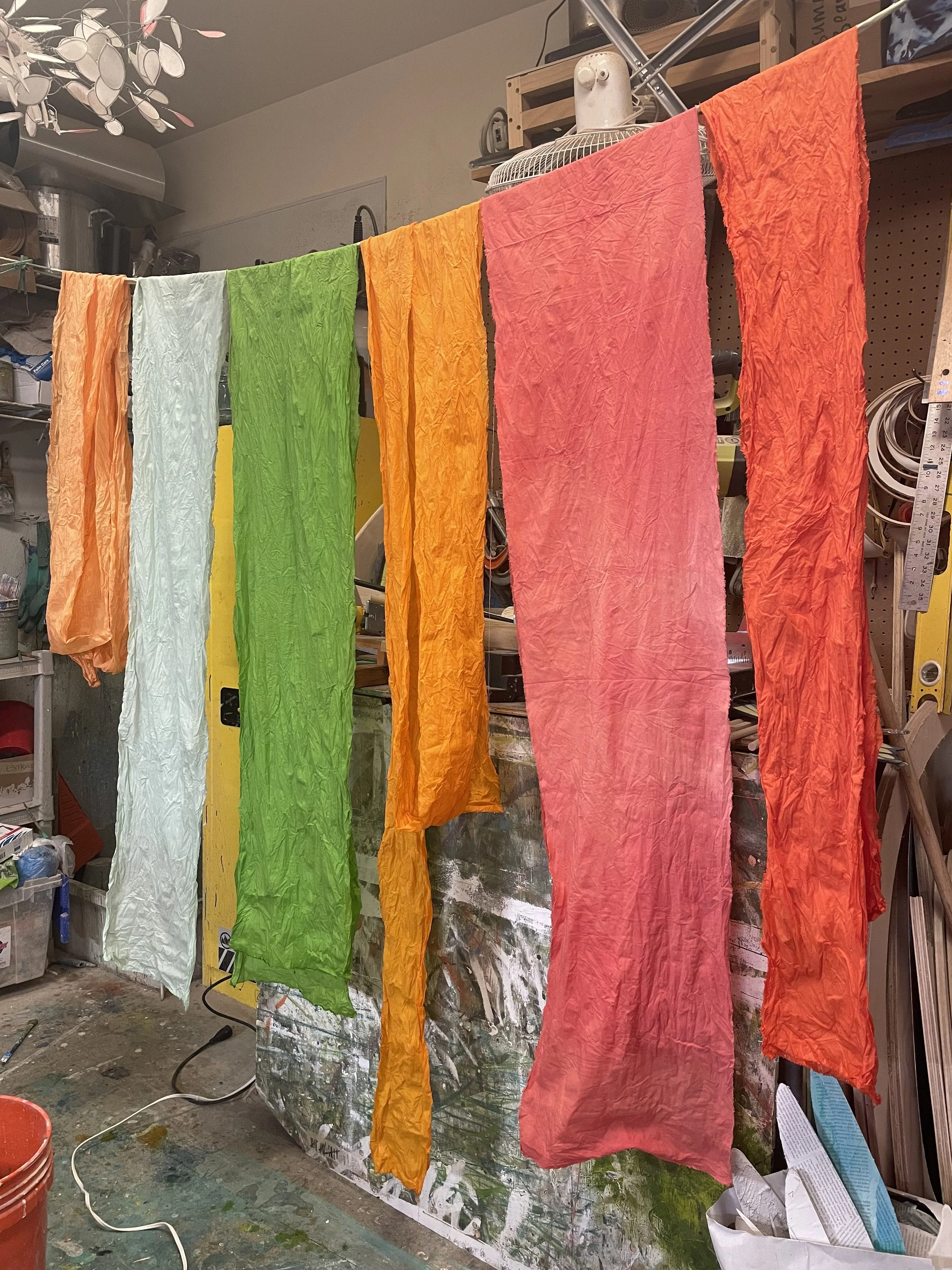 This season's spring windows were a celebration of rainbows! Large, colorful arcs were accented with dyed fabric strips and strings of hand-painted wooden beads & shapes.
