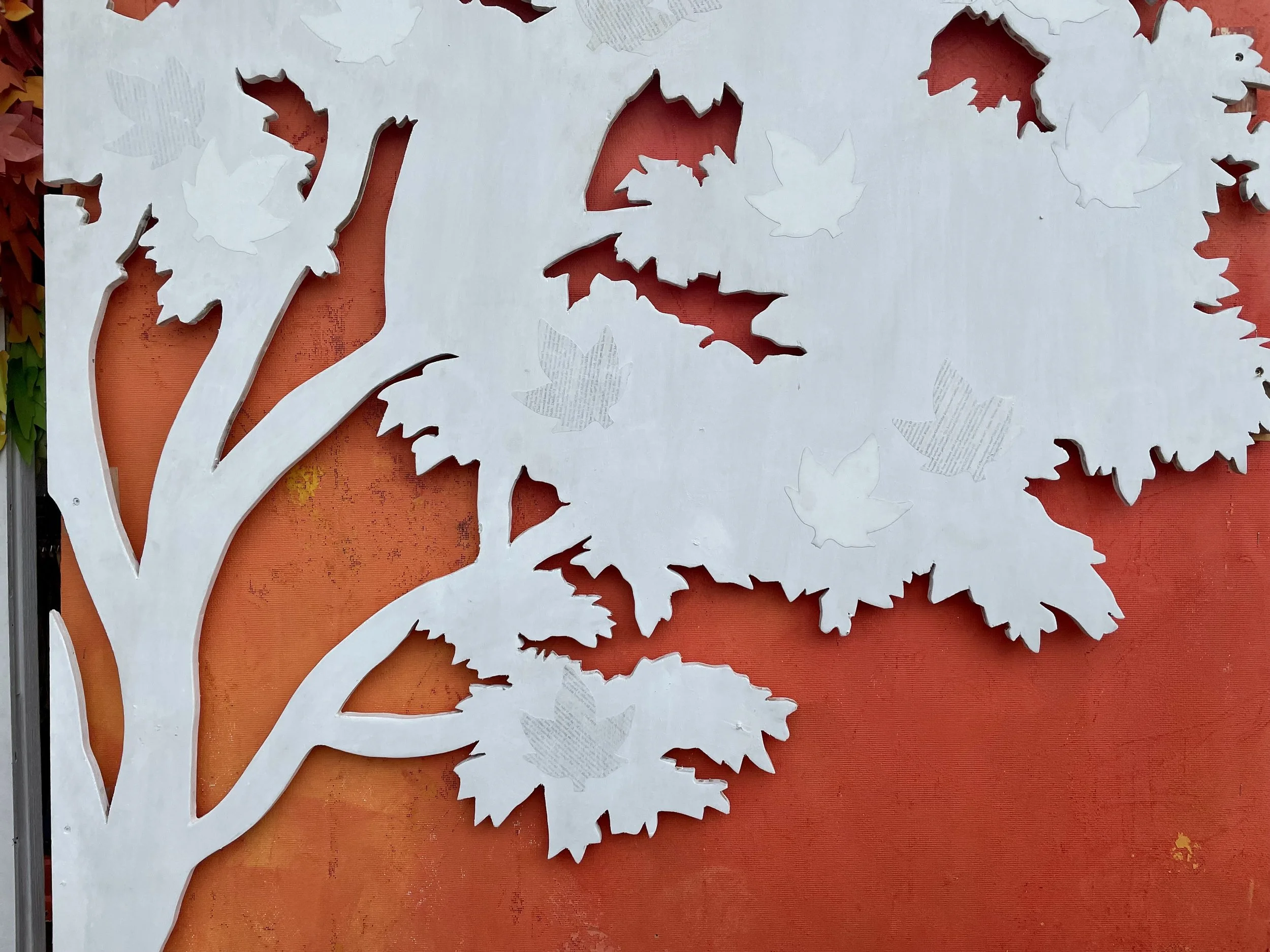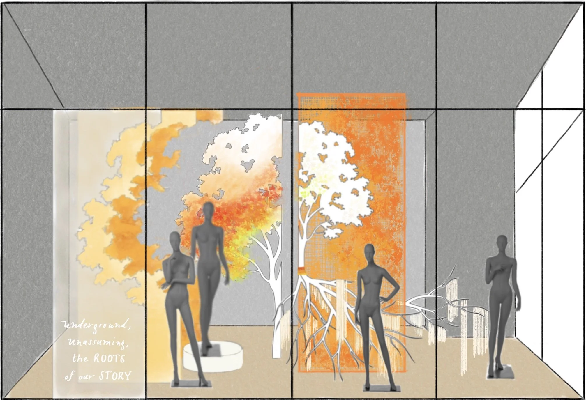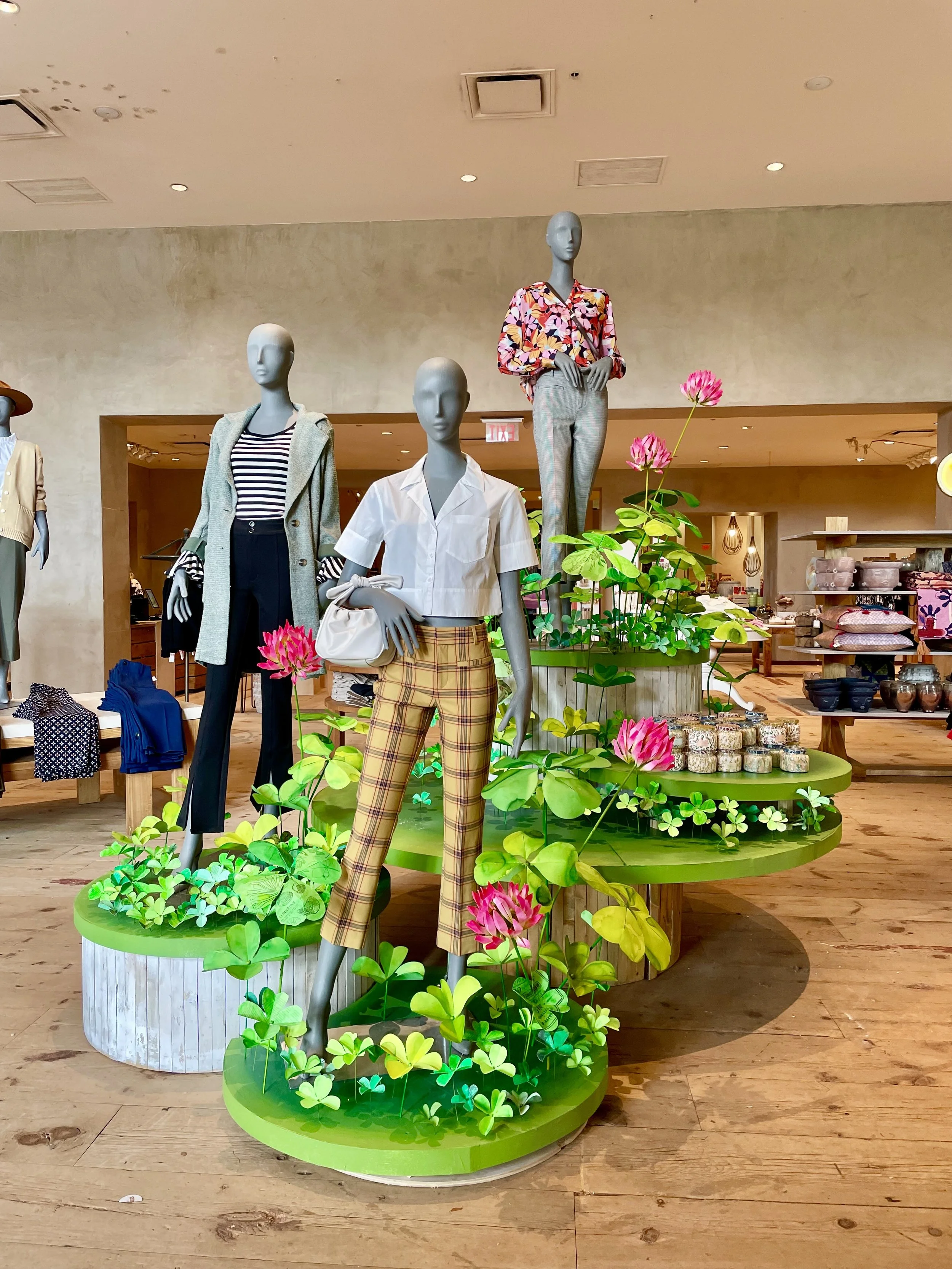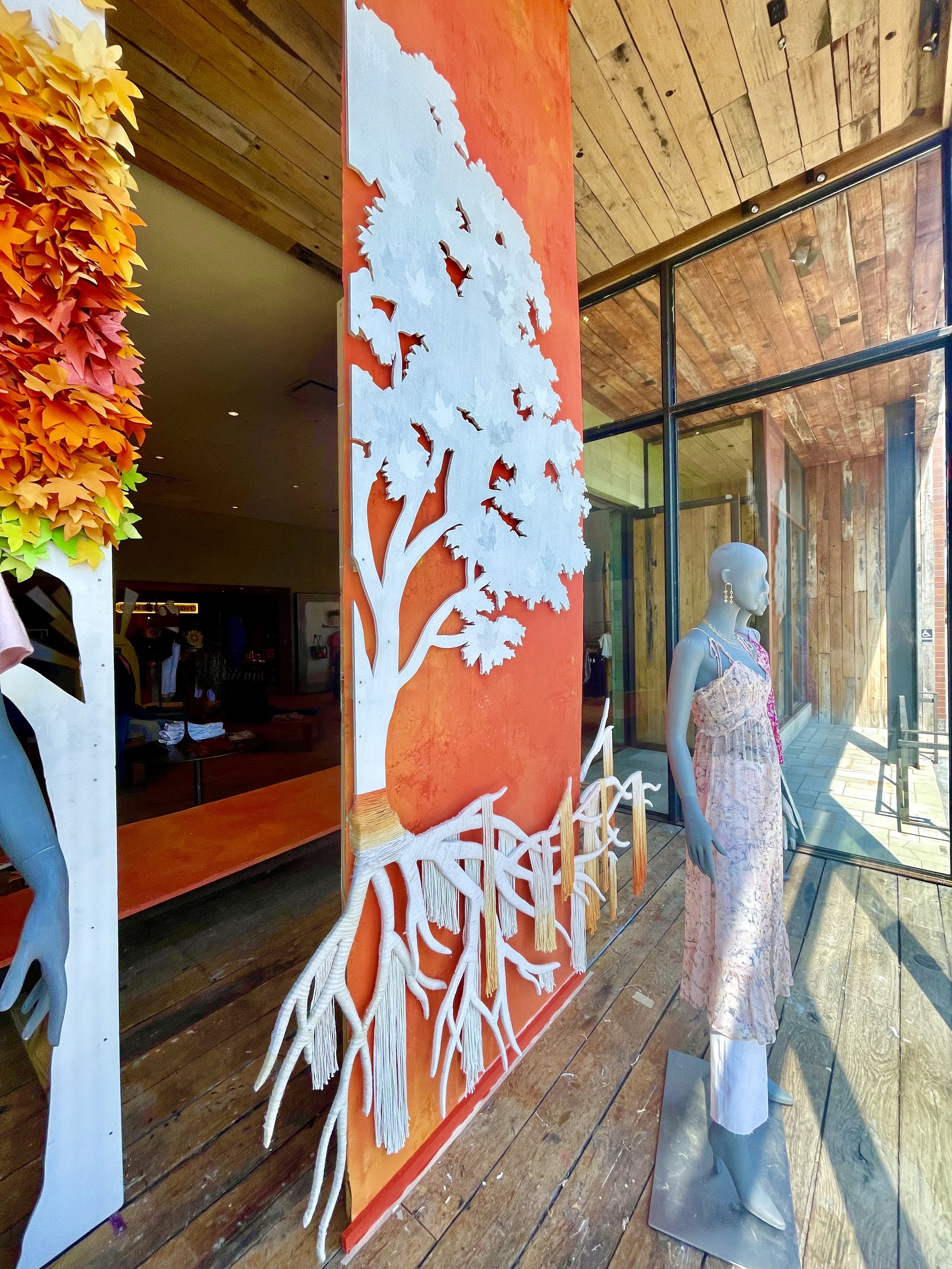 This window told the story of the tree - the tree we see above ground, and the intricate roots hidden underground. Repetition of 2D silhouettes were used to create feminine, graphic, representations of trees. Paired with sculptural 3D trunks, leaves, and root details, there is a balance of dimension and detail.